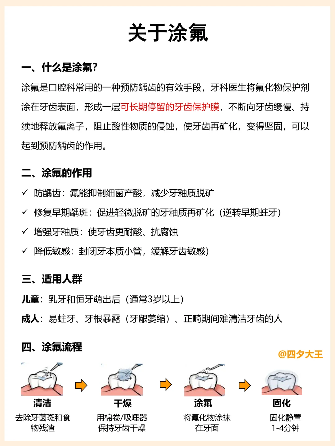 将氟化物保护剂涂在牙齿表面,形成一层可长期停留的牙齿保护膜