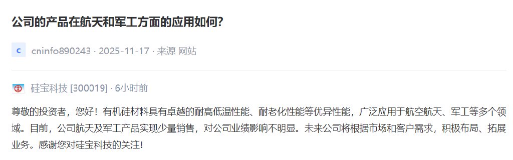 硅宝科技[300019]:有机硅材料具有卓越的耐高低温性能、耐老化性能等优异性能,广泛应用于航空航天、军工等多个领域。目前,公司航天及军工产品实现少量销售,对公司业绩影响不明显。未来公司将根据市场和客户需求,积极布局、拓展业务。