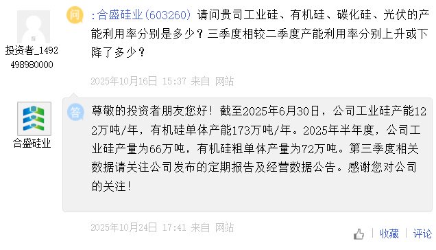 合盛硅业[603260]:截至2025年6月30日,公司工业硅产能122万吨/年,有机硅单体产能173万吨/年。2025年半年度,公司工业硅产量为66万吨,有机硅粗单体产量为72万吨。第三季度相关数据请关注公司发布的定期报告及经营数据公告。