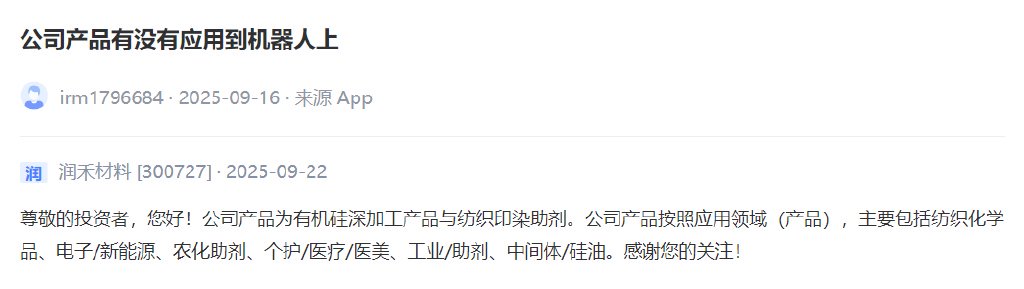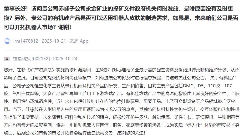 恒星科技[002132]:关于有机硅产品,公司子公司恒星化学主要从事有机硅及相关产品的研发、生产和销售,目前主要产品包括DMC、D5、110胶、107胶、气相白炭黑等,大多产品需经再加工后用于下游终端产品。有机硅终端产品中的高温硅橡胶由于其良好的安全性、亲肤性、耐用性与环境适应性,近年来在包括硅胶娃娃在内的各类硅胶玩具、母婴用品、电子可穿戴设备等产品领域被广泛应用。当下,硅橡胶在人形机器人中的应用正逐渐成为技术发展的热点,其独特的材料特性为仿生设计、交互体验和功能性提升提供了重要支持。未来随着材料科学和AI技术的结合,硅橡胶在仿生皮肤、触觉传感、柔性关节、表情模拟、生物相容等方向均有很大的发展空间,将进一步推动机器人在医疗、服务、家庭等场景的渗透,成为实现“类人化”体验的重要技术突破口。