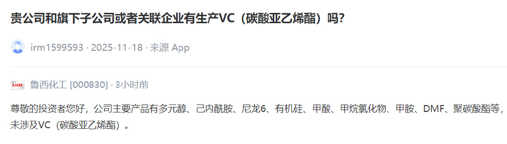 鲁西化工[000830]:公司主要产品有多元醇、己内酰胺、尼龙6、有机硅、甲酸、甲烷氯化物、甲胺、DMF、聚碳酸酯等,未涉及VC(碳酸亚乙烯酯)。