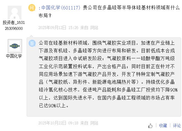中国化学[601117]:公司在硅基新材料领域,围绕气凝胶实业项目,加速在产业链上下游及有机硅、多晶硅等方向进行布局和研发。目前低成本合成气凝胶项目进入中试研发阶段;气凝胶原料——硅酸甲酯万吨级工业化示范装置投料试车,产出合格产品;同时目前正在针对不同应用场景加速下游气凝胶产品开发,开发了特种定制气凝胶产品(气凝胶纸、异形件、新能源电池隔热片等)。持续优化多晶硅冷氢化核心技术,促进吨产品能耗和多晶硅工厂投资均下降90%以上,达到国际先进水平,在国内多晶硅工程领域的市场占有率已达90%以上。