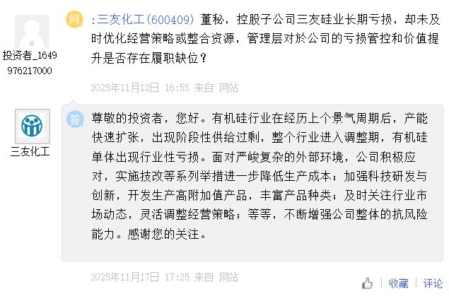 控股子公司三友硅业长期亏损,却未及时优化经营策略或整合资源,管理层对于公司的亏损管控和价值提升是否存在履职缺位?