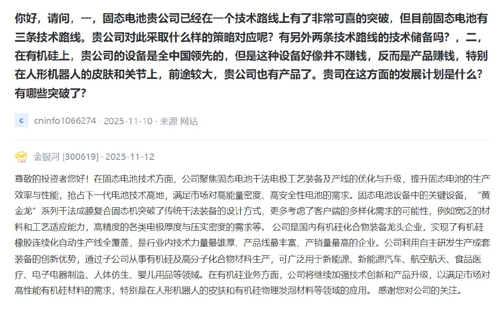 在有机硅上,贵公司的设备是全中国领先的,但是这种设备好像并不赚钱,反而是产品赚钱,特别在人形机器人的皮肤和关节上,前途较大,贵公司也有产品了。贵司在这方面的发展计划是什么?有哪些突破了?