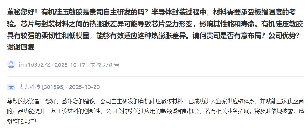 太力科技[301595]:公司自主研发的有机硅压敏胶材料,已成功进入宜家供应链体系,并赋能宜家供应商的产品功能提升。基于该材料的创新性,公司会持续关注应用的新领域和新机会,若有相关业务拓展,将及时依规披露。