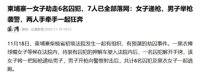 柬埔寨法院劫囚的女子被抓了 11月18日上午,这名来自越南的女子,携带手枪,成功在柬埔寨法院,劫走了六名犯罪分子。这名越南女子,开创了一项纪录,单枪匹马从柬埔寨法院,劫走了6名越南毒贩。 但是这名女子是否参与贩毒,目前不确定。这名越南女子的胆子真大,以前还没听说过1名女子,能同时救助6名同伙的先例,但是这名越南女子做到了,但是用的不是地方! 从现场曝光的视频来看,没人想到,这个看似普通的身影,正酝酿着一场惊人的劫囚行动。 当执法人员打开车门,准备将囚犯卸下时,人群里突然有个囚犯动了,他竟然悄悄解开了自己的手铐,径直朝着黑衣女子走去。 就在这一瞬间,女子迅速从上衣腹间掏出一把短枪,稳稳地递到了这名囚犯手里。接枪的囚犯立刻转身,朝着旁边的警员扣动了扳机。 枪声一响,现场顿时乱了起来。有警员吓得赶紧趴到地上,甚至往车底钻。 趁着混乱,女子和这名持枪囚犯手牵手狂奔,另外 5 名囚犯也跟着一起冲出人群。 几人快步跑出法院大门,早已等候在路边的黑色雷克萨斯轿车立刻打开车门,7 个人一跃而上,车子随即加速消失在街道尽头。 从递枪到逃逸,整个过程还不到一分钟,动作快得像事先演练过无数次。 柬埔寨监狱总局很快确认,这 6 名逃犯全是越南籍,今年 1 月因为涉嫌毒品交易、网络诈骗等多项罪名被逮捕,当天本是来法院接受审判的。 而那名黑衣女子也是越南人,看起来和这伙囚犯是同伙。案件发生后,柴桢省警方立刻联合宪兵部队启动紧急追捕,一张大网迅速铺开。 仅仅过了一个小时,追捕组就传来消息:在市郊一处池塘边,他们成功拦截了那辆黑色雷克萨斯,当场抓获了 1 名试图跳车逃跑的罪犯。 但此时车里只剩下这 1 个人,其余 6 人已经提前下车,躲了起来。 警方没有停顿,通过线索追踪,到当天下午 3 点多,终于锁定了其余 6 人的藏匿地点,是在一个偏远的村庄。 随后,合作司、省县执法力量加上武装部队,迅速包围了这个村庄。村民屋后的田野和树林里,正是逃犯们的藏身之处。 当执法人员靠近时,树林里突然传来枪声,逃犯们拿着武器负隅顽抗,双方立刻展开了交火。 交火持续了一段时间,下午 6 点整,执法人员率先抓获了 4 名逃犯。 十分钟后,又有 2 人被制服。到下午 6 点 40 分,最后一名逃犯也被逮捕,这场紧张的围捕行动终于宣告结束。从上午枪响到深夜全部落网,整个追捕过程只用了 9 个小时。 被捕的 7 名涉案人员很快被送往羁押场所。警方在现场查获了不少东西:除了那辆用于逃逸的黑色雷克萨斯,还有一把手枪、多支 AK 步枪以及其他武器。 目前,这些人都被关了起来,执法部门正在深入调查,要查清这些枪支是从哪里来的,背后还有没有更大的犯罪网络。 这起劫囚案也暴露出法院的安保漏洞,引发了当地公众和民间团体的批评。 柬埔寨政府已经临时关闭了法院周边的道路,增派了治安部队,还启动了全国范围内的监狱安保审查。 而原本定在 11 月 18 日的那 6 名越南籍囚犯的庭审,也只能无限期推迟了。被捕的 7 个人,除了之前的毒品、诈骗罪名,现在又多了一项劫狱的指控。 这场惊心动魄的劫囚与追捕,最终以全部涉案人员落网告终。没有人员死亡,只有 1 名警察受了轻伤,法院里其他的囚犯也没受到太大影响。 目前,案件还在进一步调查中,关于那名黑衣女子和逃犯们更多的涉案细节,还要等执法部门的后续通报。