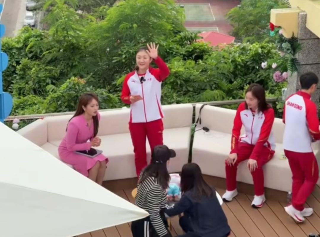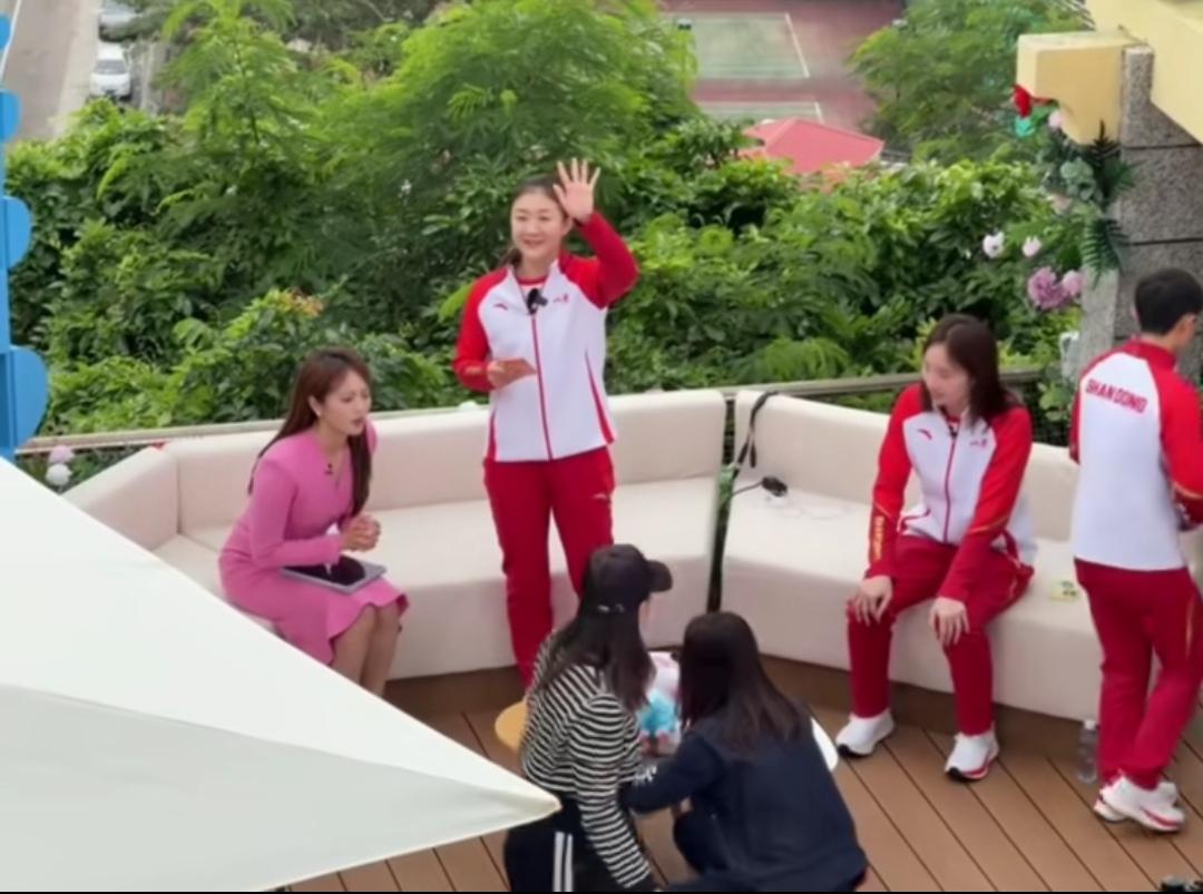 11月20日,山东代表团接受采访,陈梦现身采访,她穿着一身红色运动服,坐在距离主持人最近的地方。 陈梦看到楼上的人,起身热情和大家打招呼,采访的主持人很甜美,穿着一身粉色职业装,很会穿。 采访的环境就是在露天场地的一张沙发上,陈梦在接受采访的时候坐的很端正。