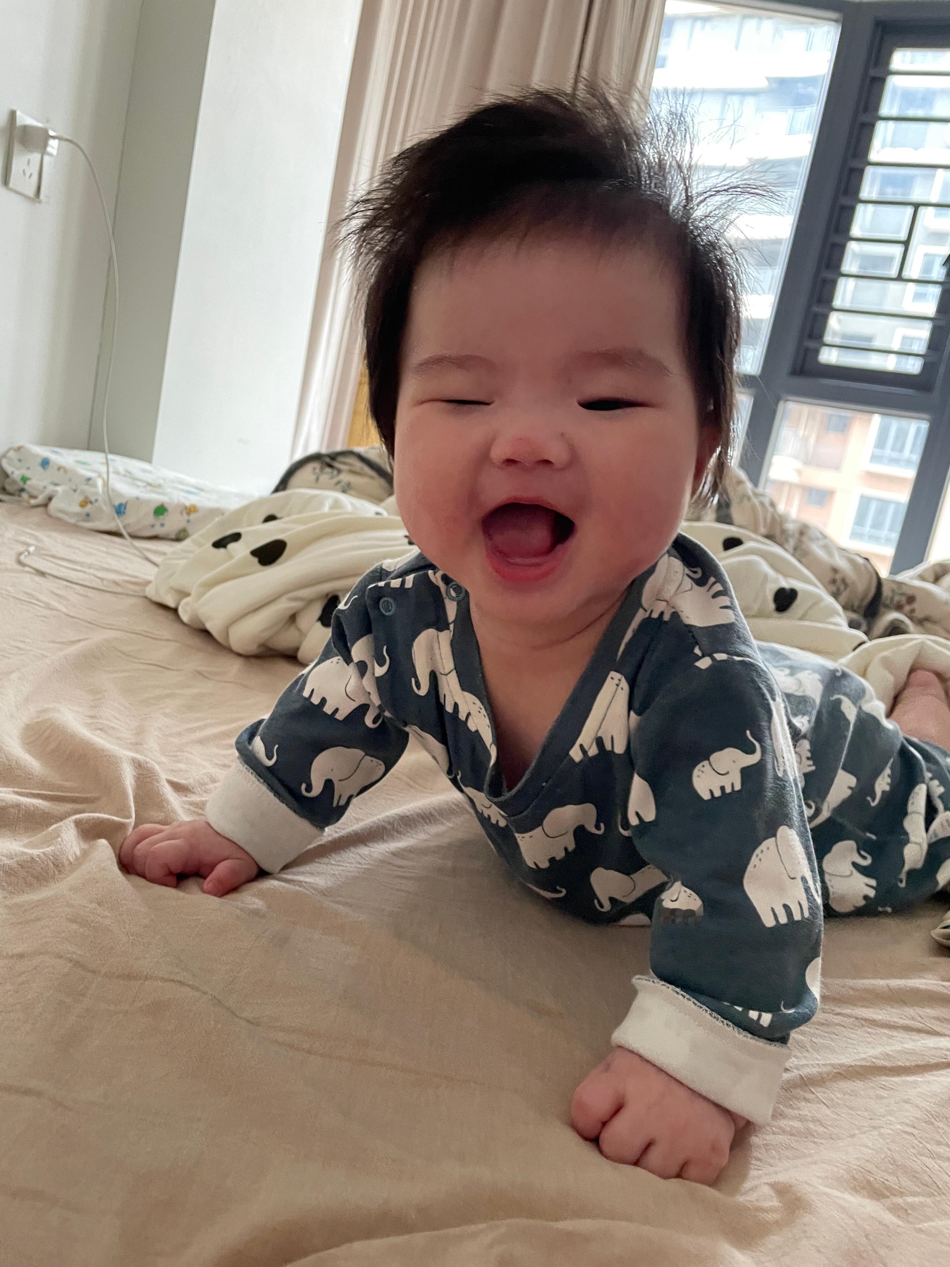 我家小宝真的太乖啦。从三个月开始就睡整觉,一天只喝四顿奶。午睡一般也可以睡一个半小时两个小时。傍晚再小睡一下,晚上十点左右睡觉,一觉可以睡到早上七点,都是这个作息,稳定得很,真的是神仙宝宝~而且醒着的时候也会自己玩,最难的就是抓到什么吃什么,然后爱吃手。