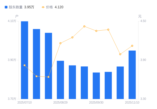 近一年(2024年11月20日至2025年11月10日),华联控股A股股东户数从3.76万户,增加至3.95万户,增幅4.96%,区间股价下跌21.82%。