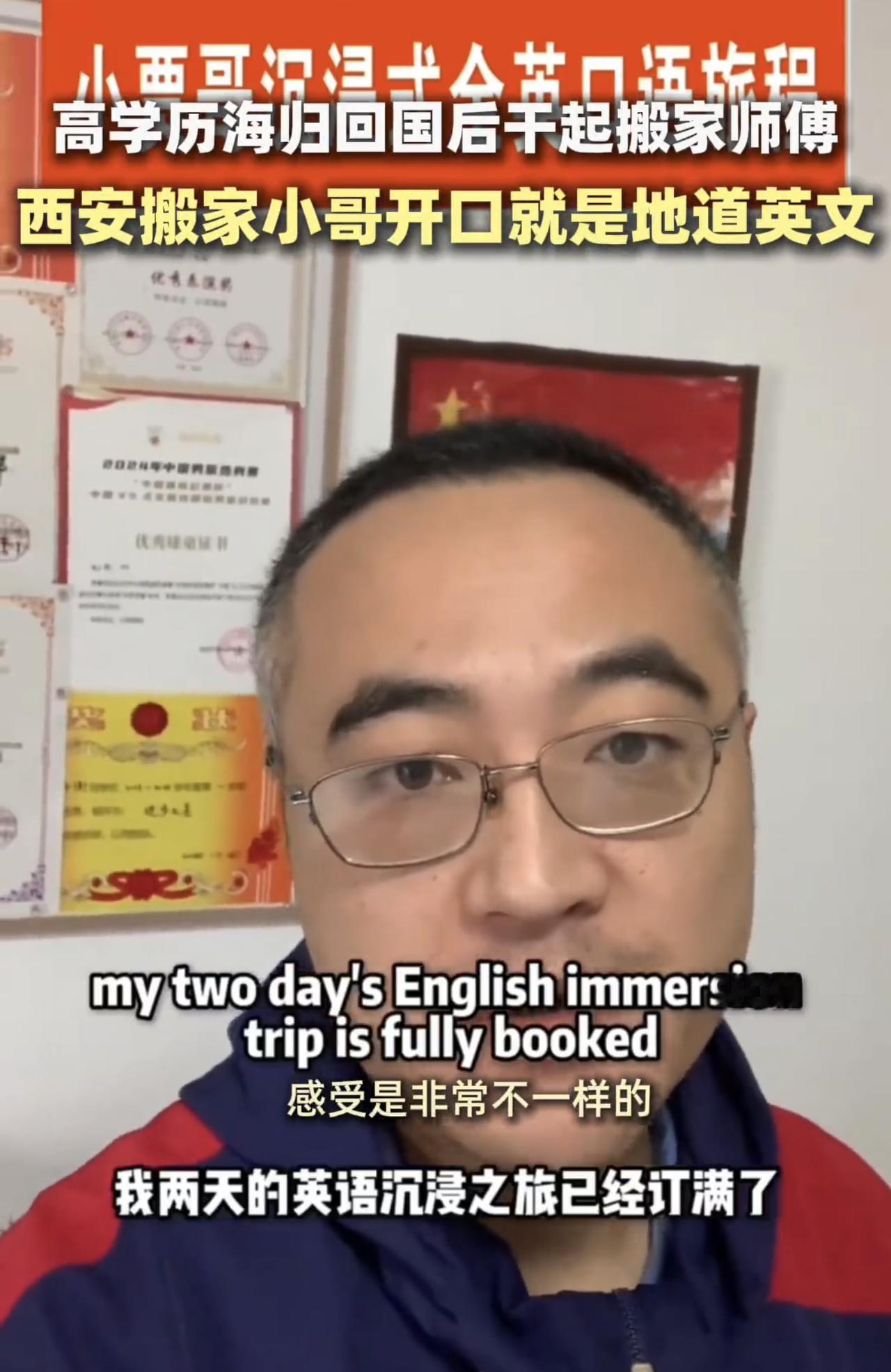 刚刷到一个视频,西安一搬家小哥贾玉慧,在给外国客户搬家具时,全程用英语交流,说的也很流利[机智]!这引起一些网友讨论,说他英语这么好,为何还要做个搬家的? 这个搬家的小哥,是从澳大利亚留学回来的海归!记者问他为啥选这个工作?这个80后笑得挺淡定,他说要撕掉自己的标签,比办公室数钱美得多[笑哭]! 他在搬家家公司上班,对每个订单都很认真。他说有一回帮外国朋友搬家,那位外国朋友还特惊讶,跟他说:“你英语比我的中文好多了”[我想静静]! 看着他擦汗努力工作的样子,我突然明白,体面不是看在哪上班,而是自己能做喜欢的工作。对这位海归的选择,你是怎么看的呢?来评论区说下你的想法吧!图片来源:红星新闻