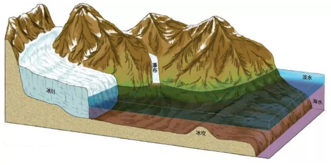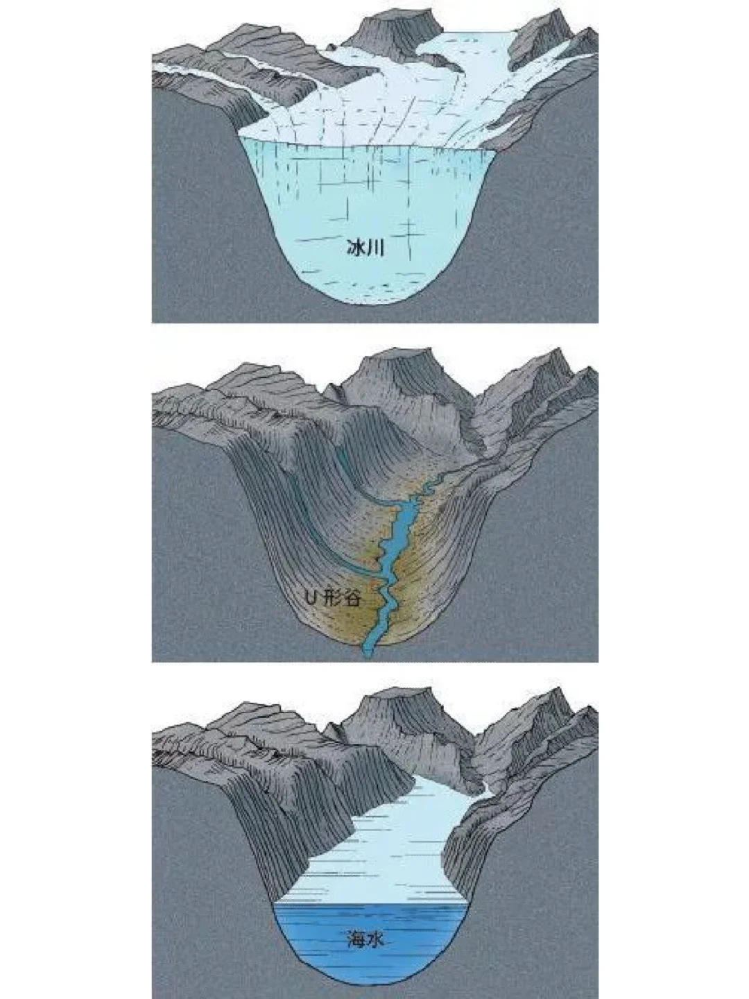 🌏“峡湾地貌”是一种冰川侵蚀地貌,而且是冰川要下滑到海平面附近,因此形成峡湾地貌的区域必须是高纬度沿海地区,高纬度地区由于纬度高,气温较低,冰川分布的海拔较低。同时冰川要表现出侵蚀性,需要利用重力作用向下滑动,所以需要一定的坡度,最好具有与海岸线平行的海岸山脉。峡湾是冰川与海洋共同作用的结果,在第四纪冰儿运动过程中,冰川对地面产生巨大的刨蚀作用,形成大量的U形谷,同时在U形谷的前缘产生冰坎。后来随着冰川的融化,海平面的上升,冰坎被海水淹没,海水倒灌进槽谷,形成了峡湾。简单来说:冰期时期,冰川侵蚀形成U型谷地;后气候变暖,冰川消退;海平面上升,海水入侵淹没,形成峡湾。