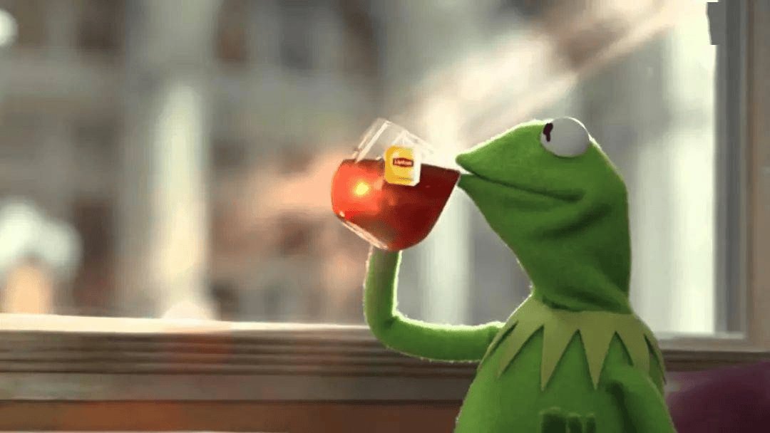 塞恩斯这里指的是著名的“科米蛙喝茶”表情包,科米蛙坐在那里,悠闲地喝着茶。