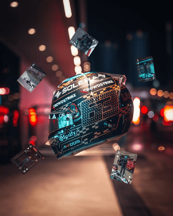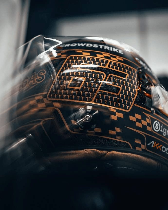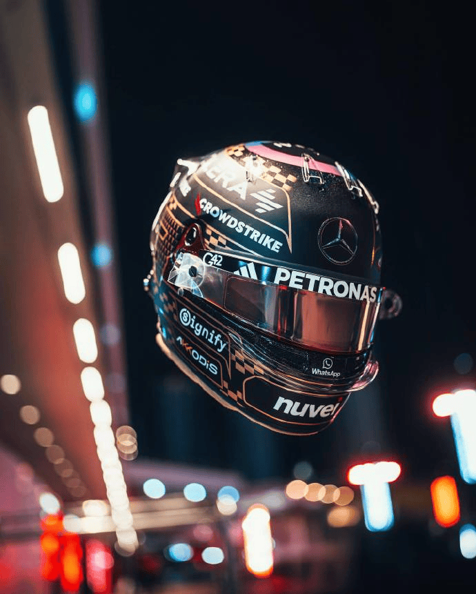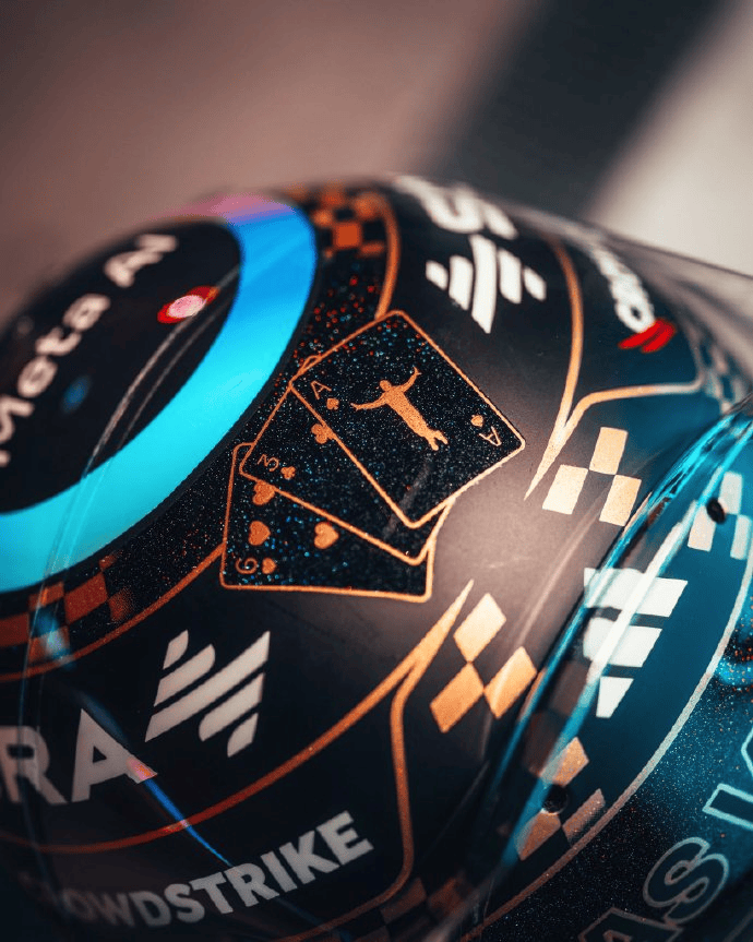 为了纪念这一时刻以及本场比赛,他带来了本站特别版头盔,上面布满了扑克牌、63的车号,以及拉塞尔标志性的“大鹏展翅”动作等代表性元素。