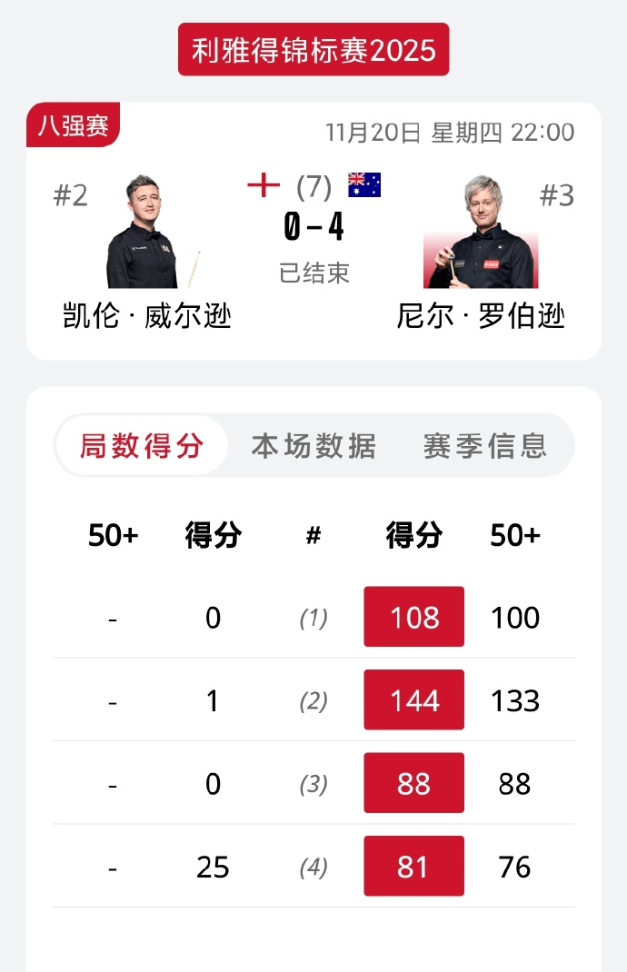 虎扑11月20日讯2025利雅得狂欢季斯诺克锦标赛第二日的一场1/4决赛里,澳洲名将尼尔-罗伯逊以4-0的比分战胜凯伦-威尔逊晋级四强。