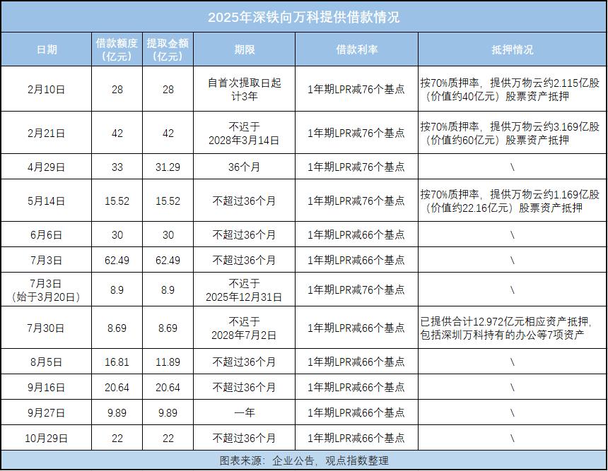 截至公告当天,深铁已累计向万科提供了12笔借款,额度合计297.94亿元,最终万科提取的金额为291.31亿元,且利率均为2.34%。