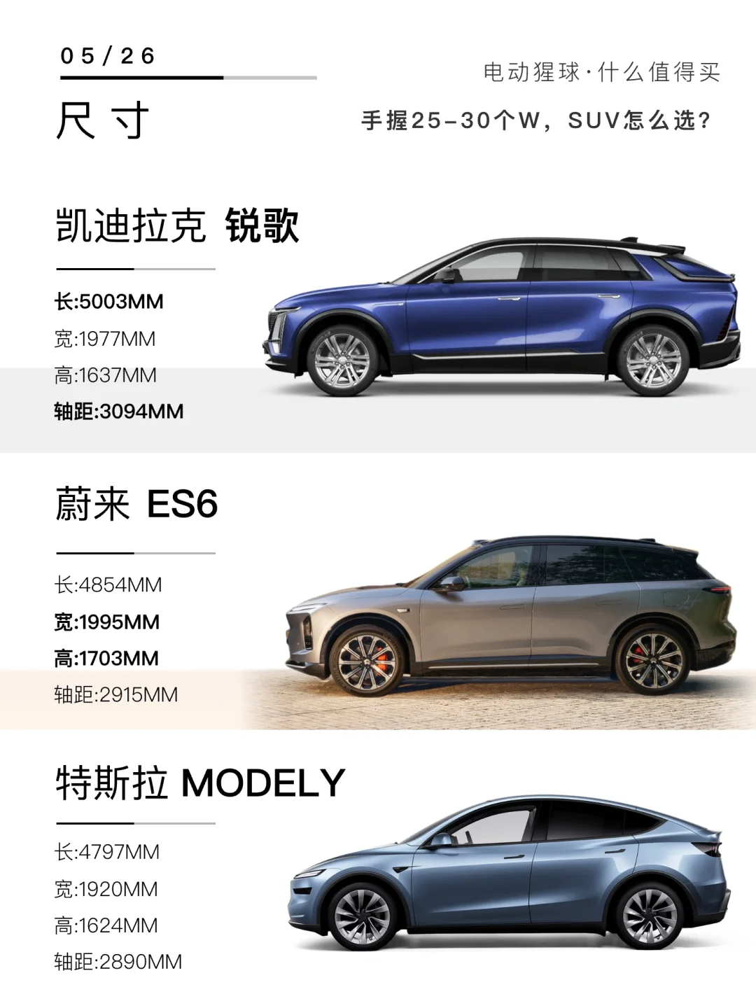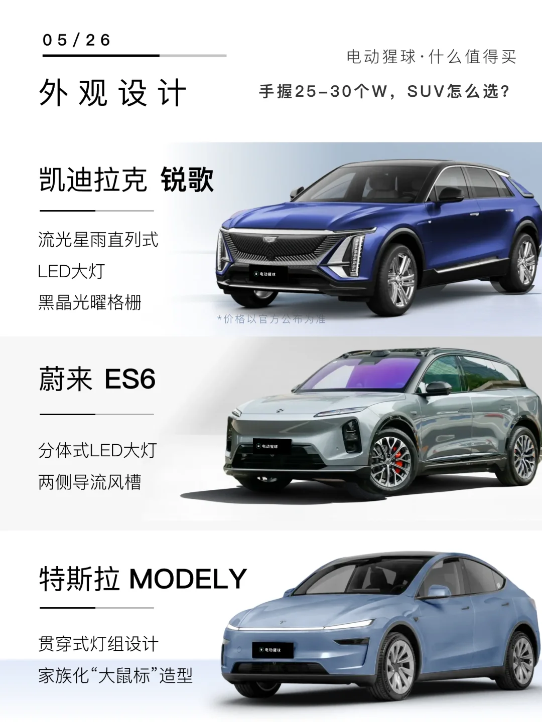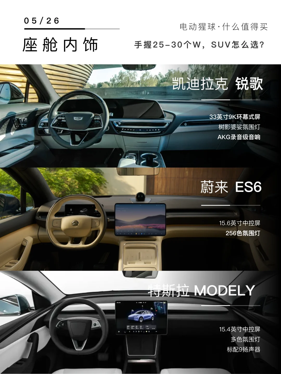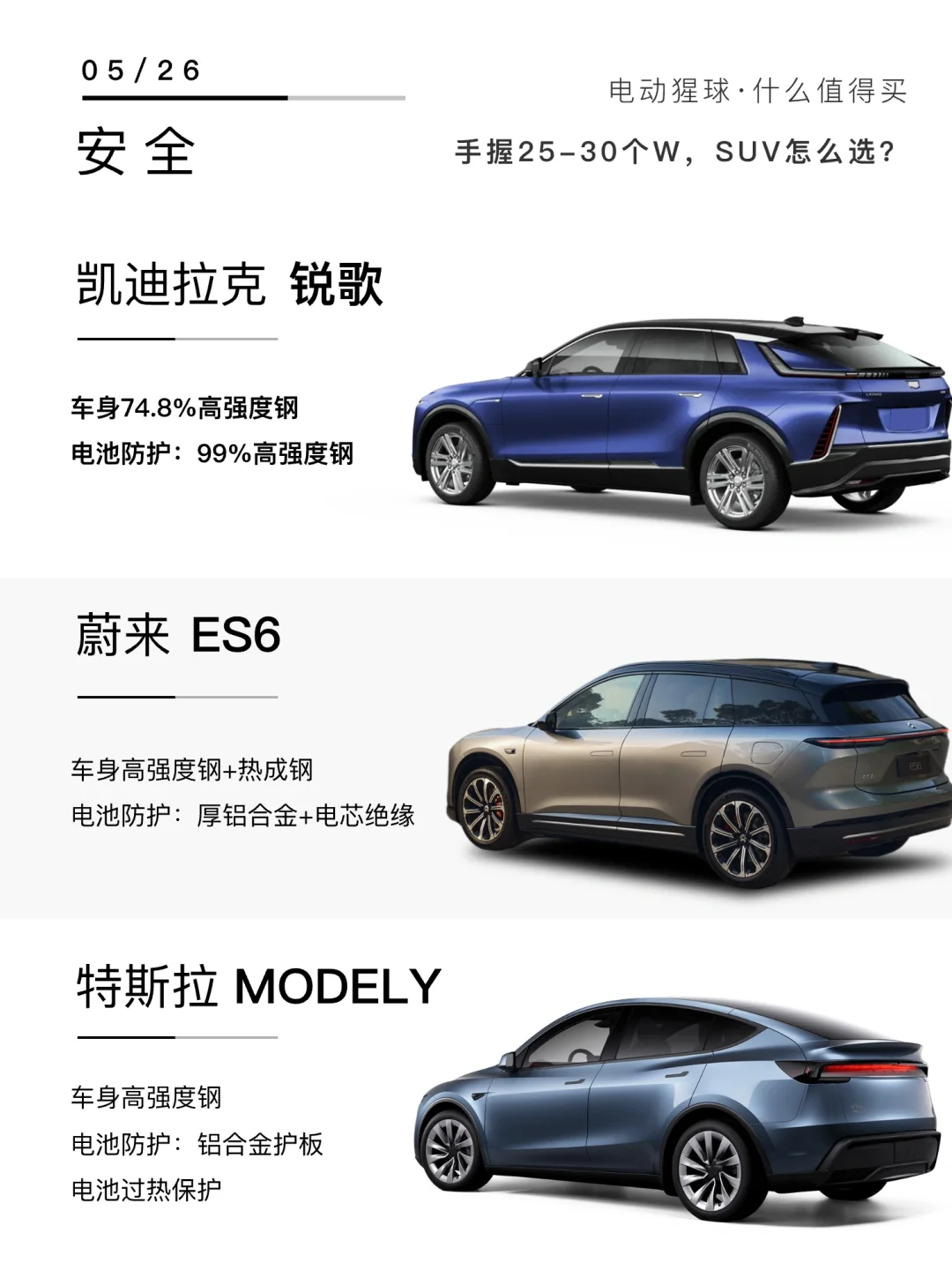 💬后台有粉丝问:手握25-30个W,想要豪华感、又想要安全,还要质价比!目前备选蔚来ES6和销量神车ModelY、还有和宝藏手机壳联名的凯迪拉克IQ锐歌,今天咱就从外观、安全、座舱配置和价格政策这几个关键维度,给大家好好盘一盘!