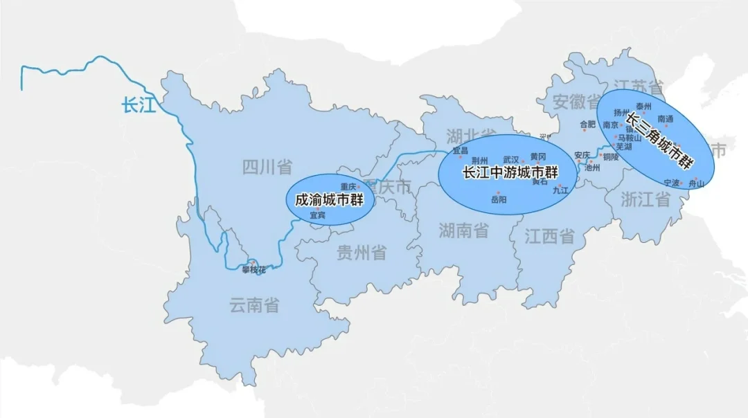 🌐长江经济带横跨中国东中西三大区域,是中央重点实施的“三大战略”之一,是具有全球影响力的内河经济带、东中西互动合作的协调发展带、沿海沿江沿边全面推进的对内对外开放带,也是生态文明建设的先行示范带。其确立了长江经济带“一轴、两翼、三极、多点”的发展新格局: