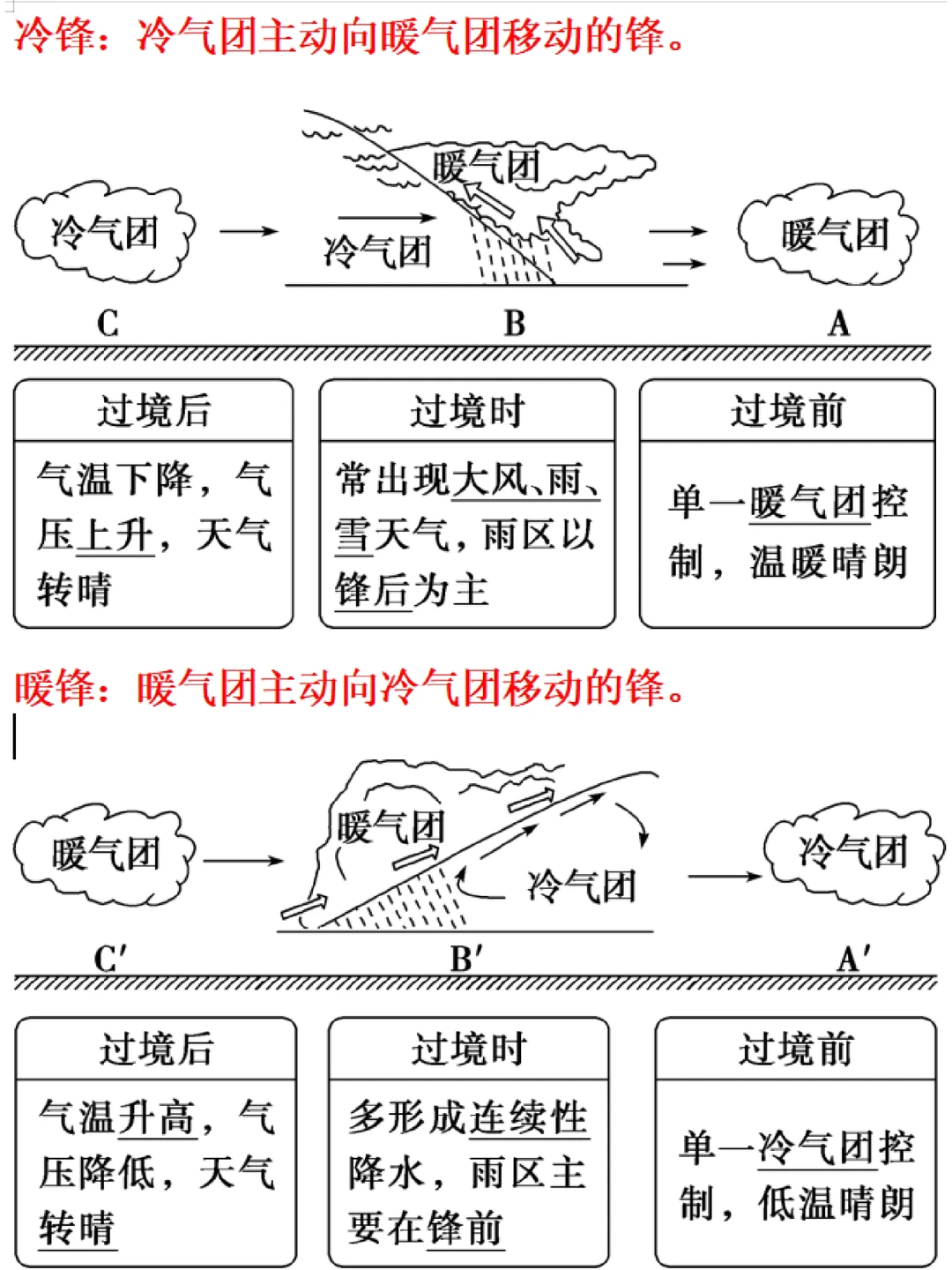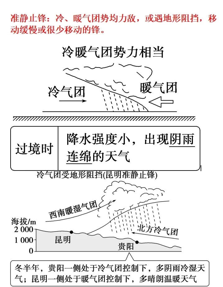 🌐气团:水平方向上温度、湿度等物理性质比较均匀,垂直方向上物理性质也很相似的大范围空气。主要分为暖气团和冷气团。 🌐锋:当冷、暖两种性质不同的气团接触时,它们之间就会出现一个交界面,叫作锋面。锋面与地面相交而成的线,叫作锋线。一般把锋面和锋线统称为锋。