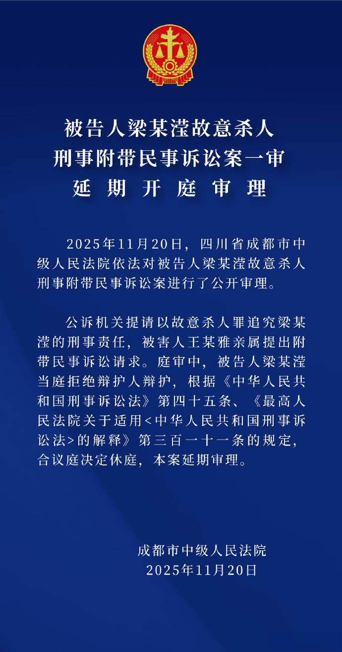 20日晚,据@成都市中级人民法院消息:2025年11月20日,四川省成都市中级人民法院依法对被告人梁某滢故意杀人刑事附带民事诉讼案进行了公开审理。