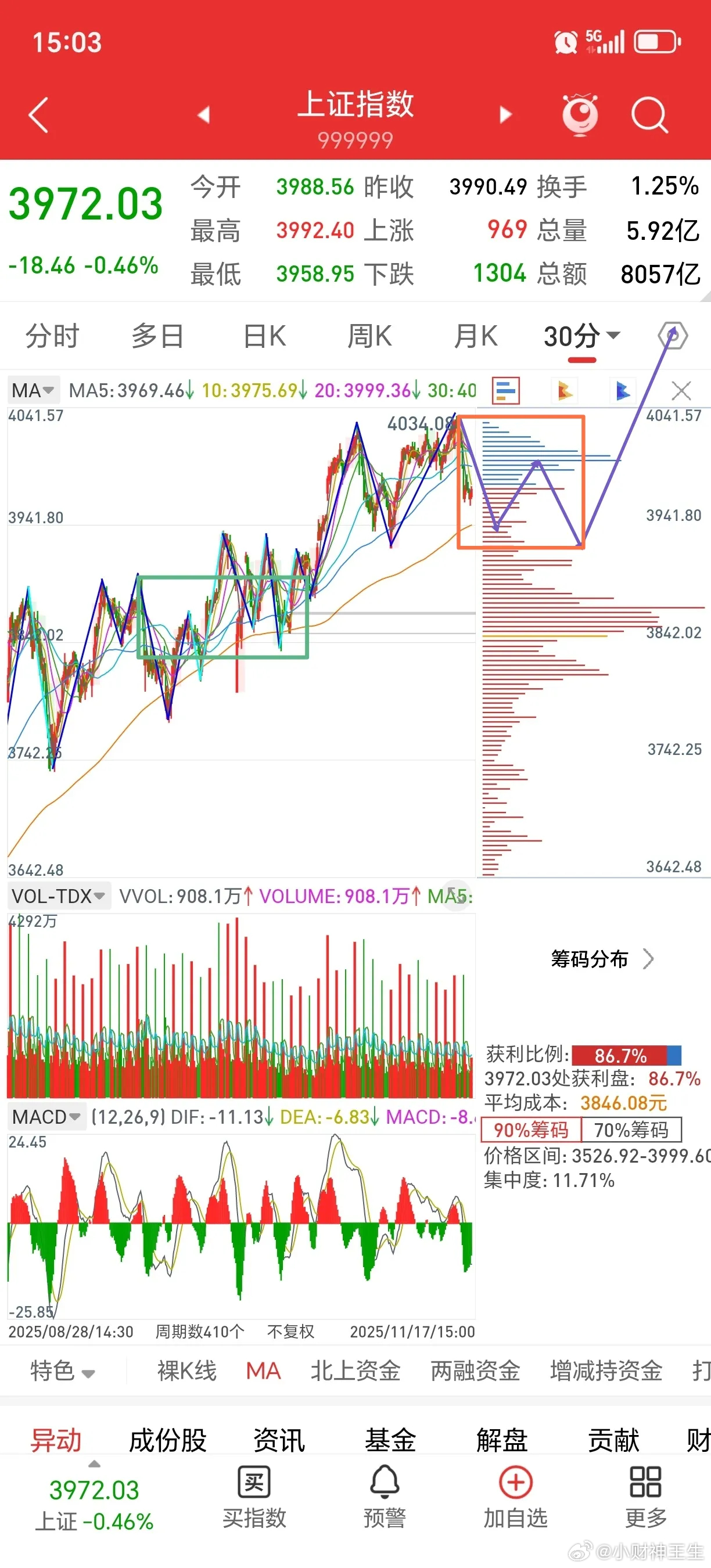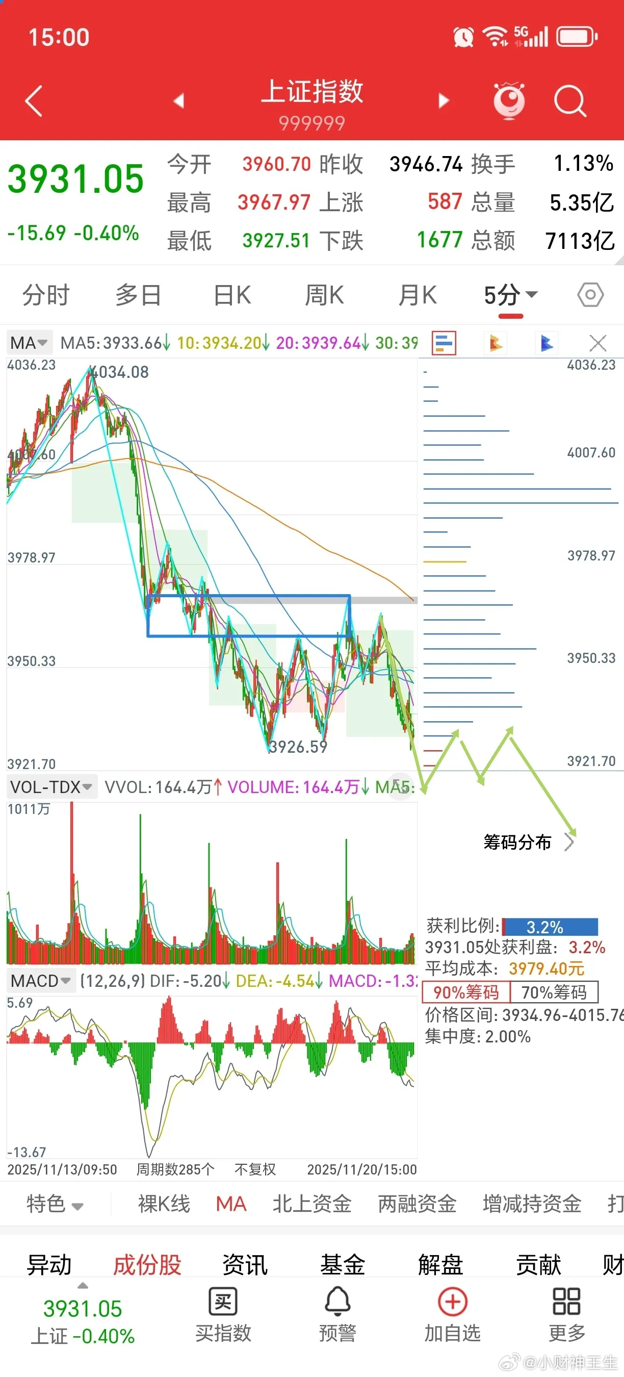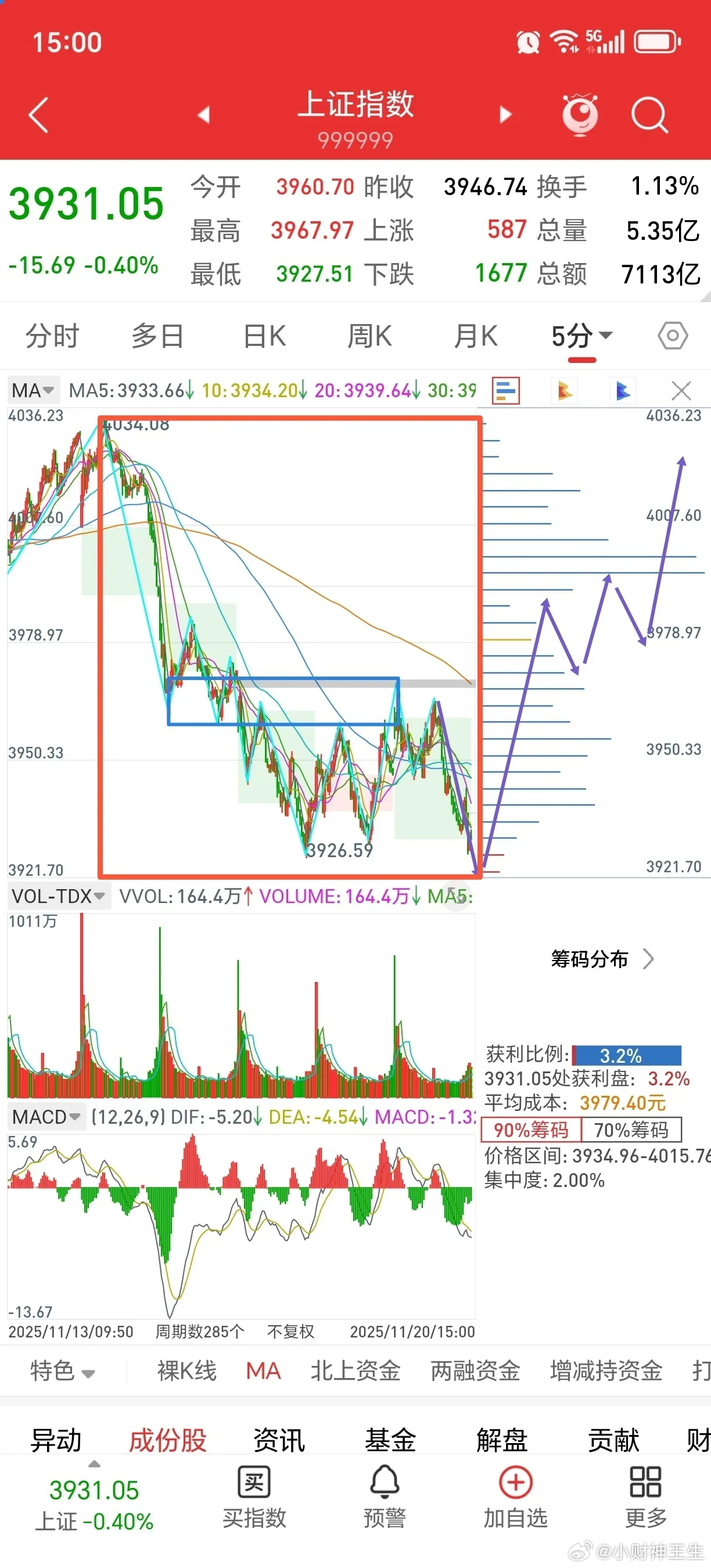 3900点很重要! 指数今天在昨晚众多利好的条件下高开,但结果是低走!近3850家等待上涨,量能也只有1.7万亿。 这几天一直在说减仓,昨天高位减了赣锋和天齐,今天早盘的上涨还一度后悔,收盘时还是庆幸自己减对了。不过赣锋和天齐应该还没结束,合适的时间还是要买回来的。 分类上明天最近下跌的一笔若不破3926,那么可以看做3926开始的一分上涨在中枢震荡(图一)。图二图三都表示破掉了3926,那么从4034开始的下跌可以看成5分盘整下了,图三表示新低后5分下就结束,那么这个5分下大概率在3900之上,对应图四就是日线中枢的3买,后续上涨仍有可能创出新高!图四表示5分中枢的离开段走一个一分下跌,那么3900是否能守住就很关键了,守得住如图四有3买,守不住进入日线中枢震荡,新高的概率就小一些了! 操作策略:这里适合半仓左右进行守候,就算出现3买,也不适宜满仓,因为3买后盘背的概率偏大,没有3买的话,反弹反而还可以适当减仓!减仓是为了后面更好的加仓,牛市还没结束哦