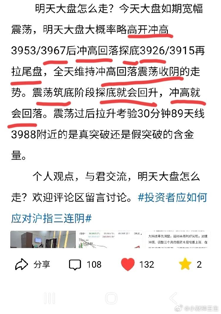 周四晚评:三大指数如期冲高回落悉数收阴,明天大盘怎么走? 早盘纳斯达克期货高开幅度超1.50%,日韩股市悉数高开幅度超2%,a50期货开盘即拉升,三大指数开盘悉数高开,创业板和科创板大幅高开,高开幅度均超1.50%,随后,三大指数高开低走如期冲高回落,双创落银行起,午后吃草效应明显扩大,下跌家数超三千八百余家,那么,明天大盘怎么走? 从大盘走势来看,周末文章判断本周大盘的整体走势是震荡回落回踩120分钟89天线,昨天和前天如期回踩了30分钟265天线3930附近,明天周五收周线,也是交割日,明天大盘大概率要展开三千九百点保卫战。 明天大盘怎么走?今天早盘纳斯达克大幅高开,日韩股市大幅高开,三大指数全天却走出了高开低走的走势,说明外围市场的表现只能影响三大指数的高低开,开盘过后还是走自己的节奏,午后如期冲高回落震荡回3926附近。明天大盘大概率继续探底3919/3909后探底回升3944/3954附近,全天维持探底回升的走势。 个人观点,与君交流,明天大盘怎么走?欢迎评论区留言讨论。