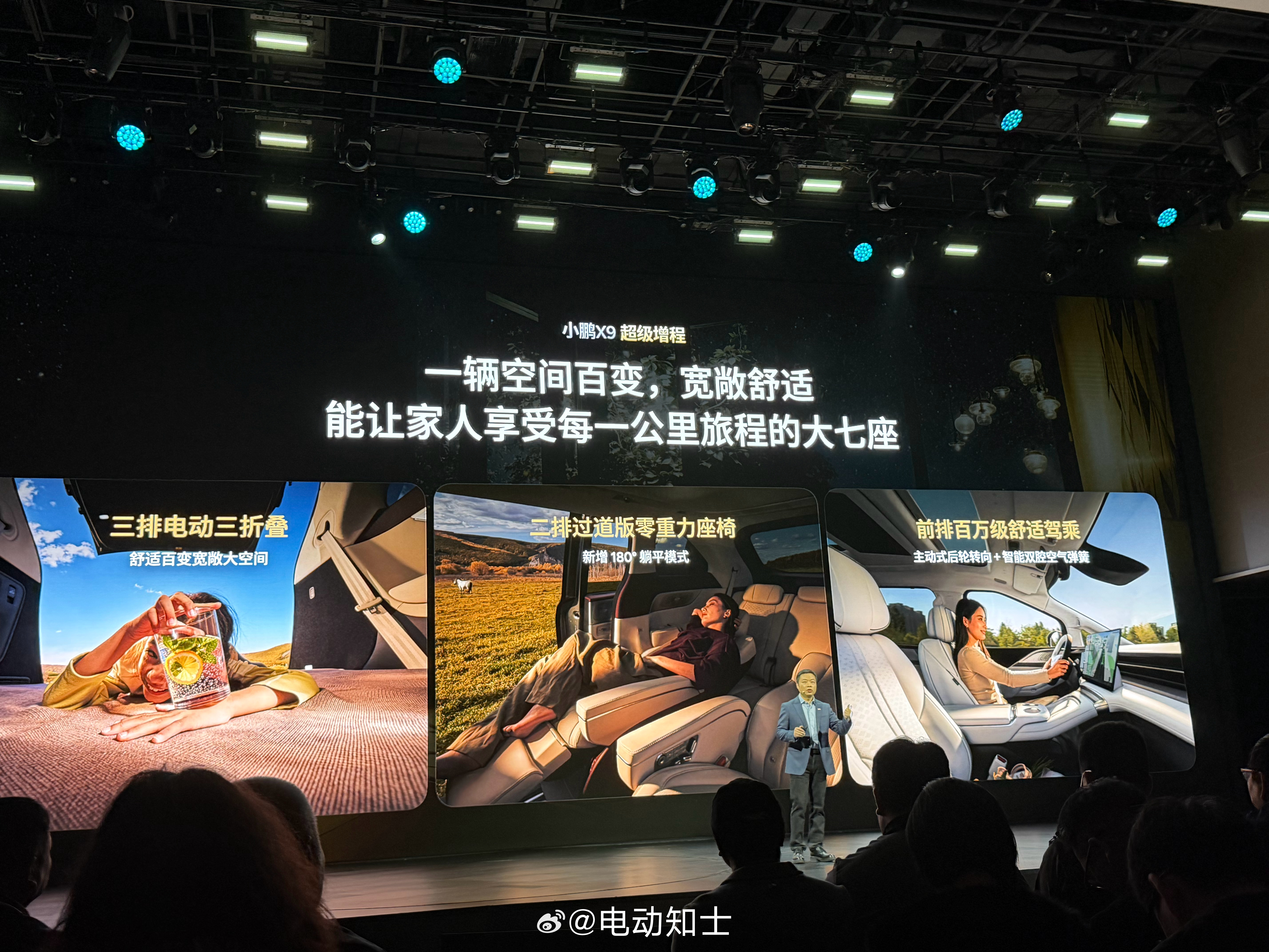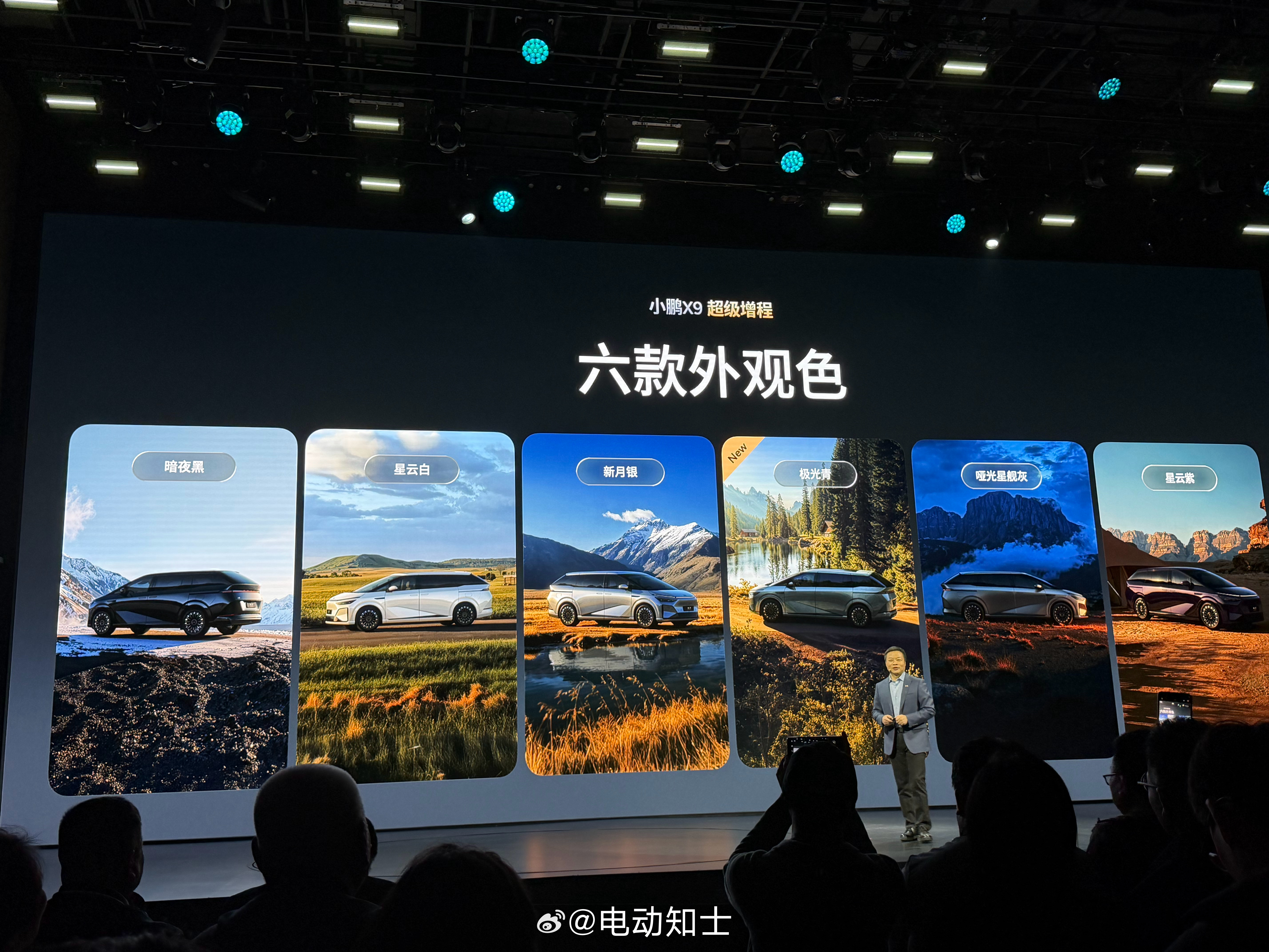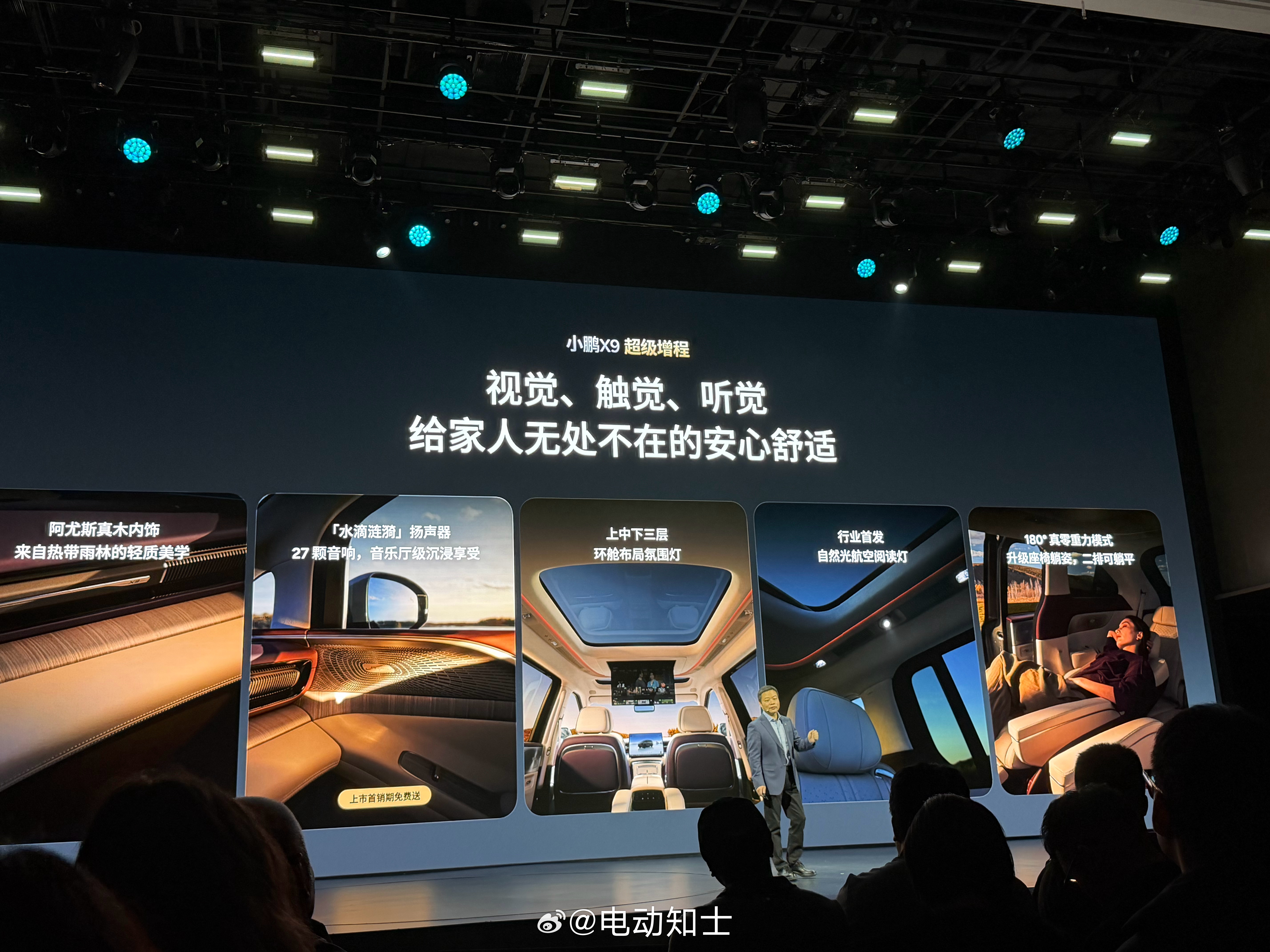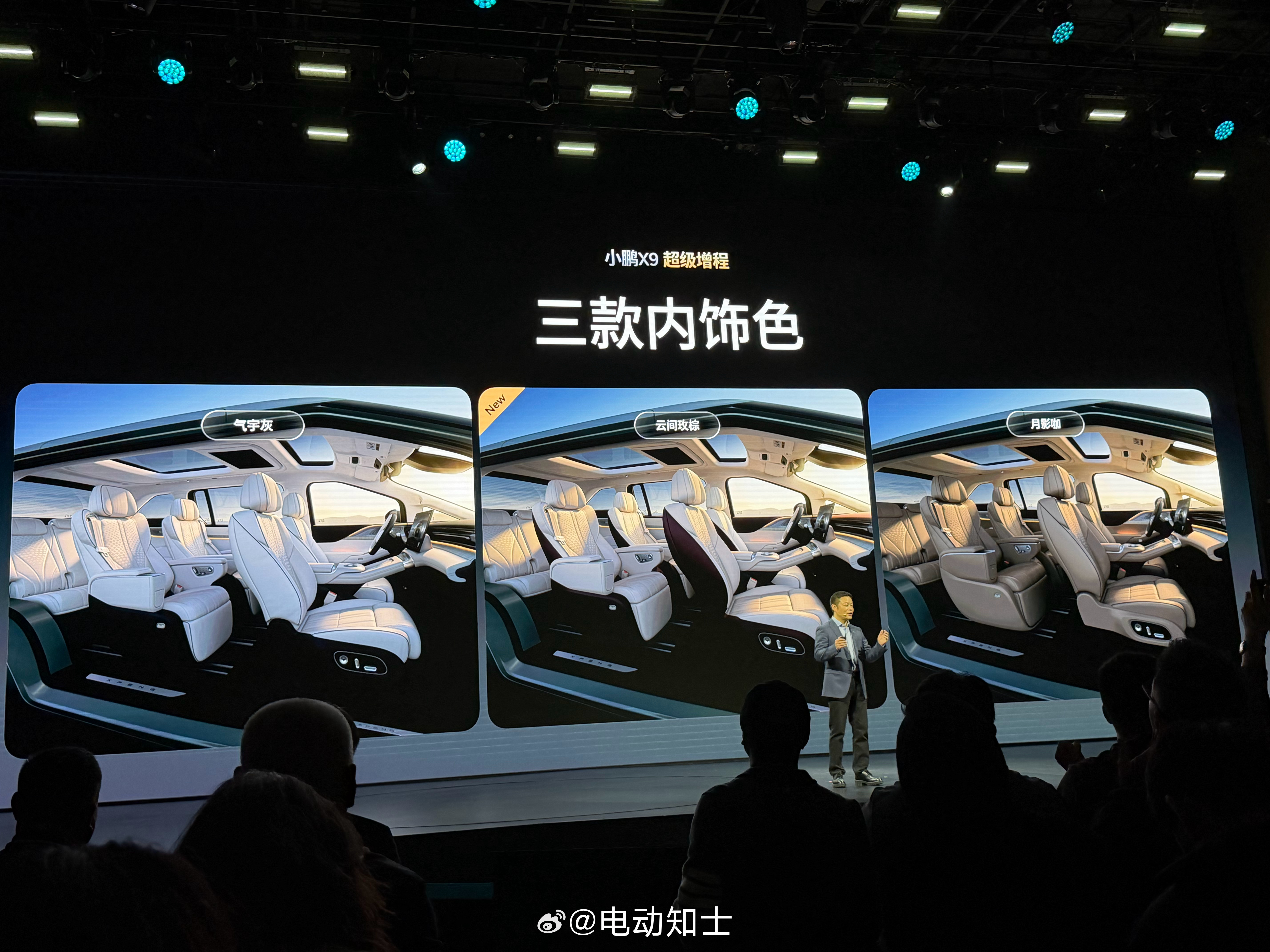 小鹏X9超级增程价格来咯,两个版本价格分别为30.98万、32.98万,小鹏要杀穿了[允悲] 六款外观配色和三款内饰色。 63.3度超快充磷酸铁锂大电池 + 60L大油箱,CLTC纯电续航452km,最长续航1602km。标配双腔空簧,调节行程90mm。 Ultra版搭载3颗自研图灵AI 芯片+1颗8295P车规级芯片,2250TOPS有效算力,MAX版搭载1颗图灵AI芯片,有效算力750TOPS。 27颗定制HiFi级扬声器,支持7.1.6声道。三排四六分电动折叠纯平收纳 ,21.4英寸生态娱乐屏 ,超3K分辨率视网膜屏。