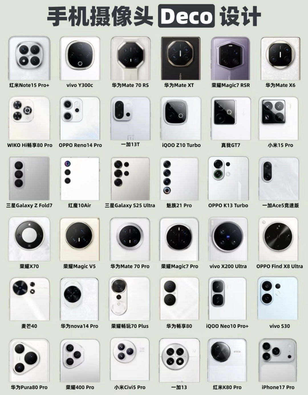 镜头模组设计有居中圆形镜头、纵向镜头、左上角矩阵镜头和居中矩阵镜头等…你的手机是