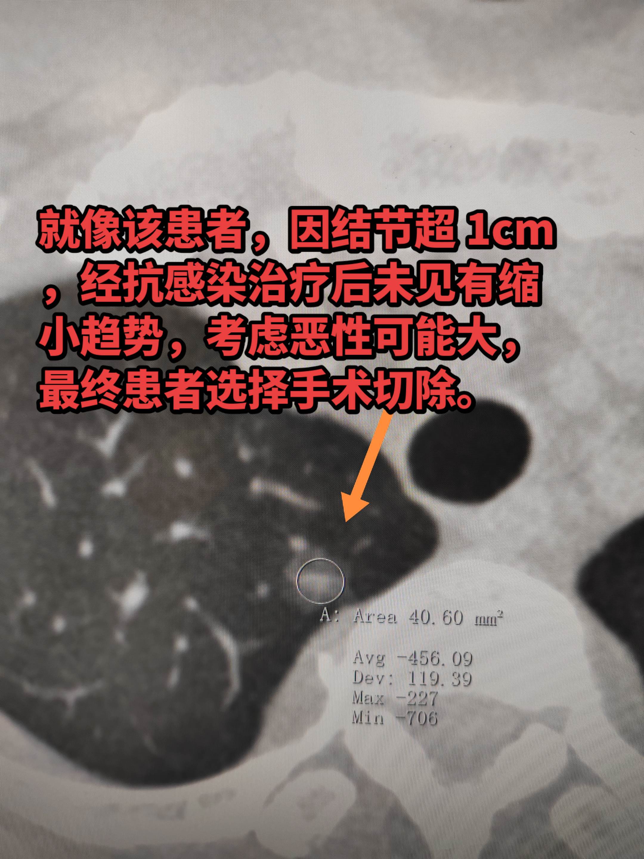 混合型磨玻璃结节界限清楚好吗?界限清楚的混合型磨玻璃结节考虑什么性质?一般这类型的结节以肿瘤性常见,但如果是第一次发现仍不建议立刻手术,一定要先观察至少半年,或者较大的结节进行抗感染治疗后复查,因为这类结节有小部分是炎性的。如经半年观察或经抗感染治疗后不缩小且结节较大才考虑手术。就像该患者,因结节超 1cm,经抗感染治疗后未见有缩小趋势,考虑恶性可能大,最终患者选择手术切除。