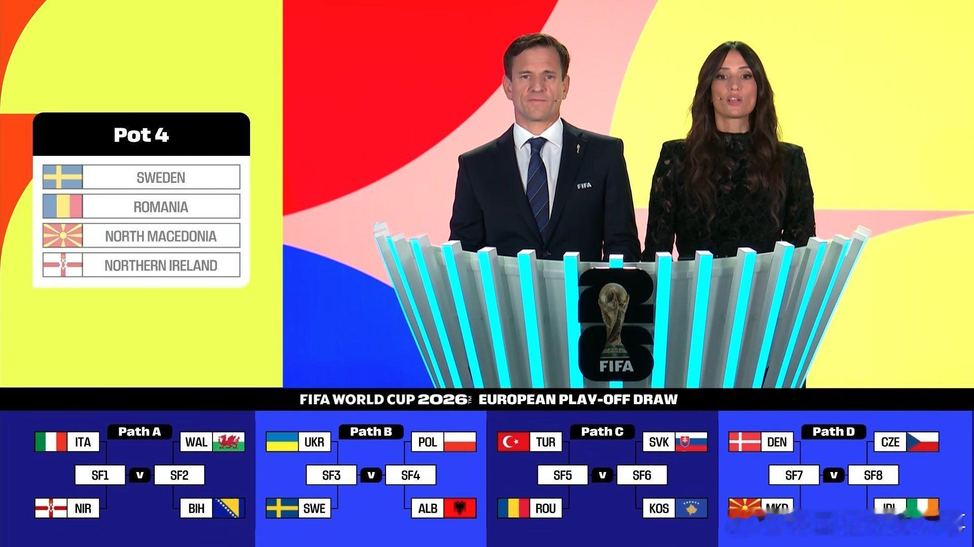 🚨世预赛欧洲区附加赛对阵出炉!单场淘汰,主队在前,明年3月底进行,每个路径产生1个晋级队伍路径 A:🇮🇹 意大利 vs. 北爱尔兰 🇬🇧🏴 威尔士 vs. 波黑 🇧🇦 路径 B:🇺🇦 乌克兰 vs. 瑞典 🇸🇪 🇵🇱 波兰 vs. 阿尔巴尼亚 🇦🇱 路径 C:🇹🇷 土耳其 vs. 罗马尼亚 🇷🇴 🇸🇰 斯洛伐克 vs. 科索沃 🇽🇰路径 D:🇩🇰 丹麦 vs. 北马其顿 🇲🇰 🇨🇿 捷克 vs. 爱尔兰 🇮🇪