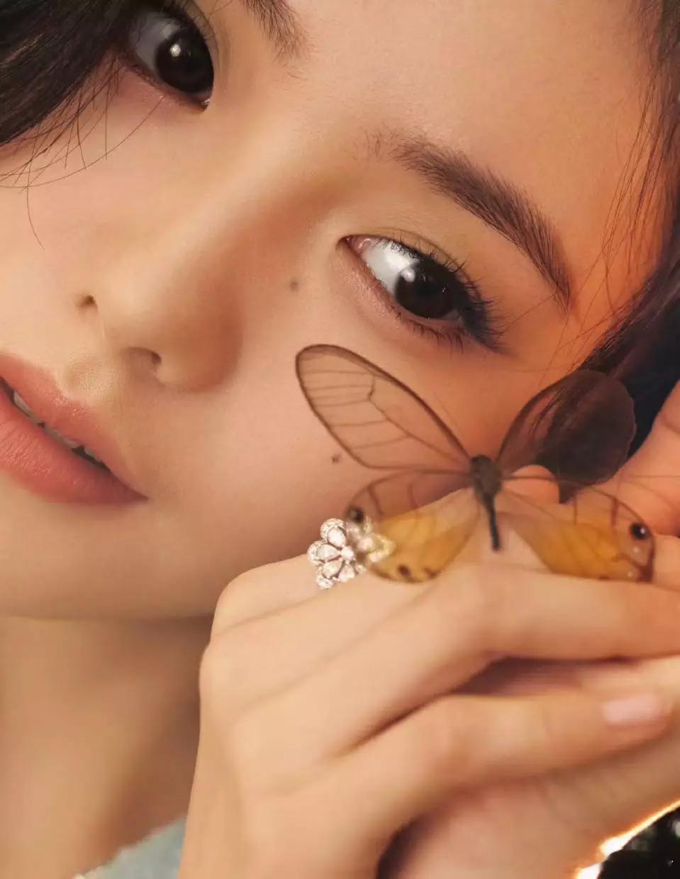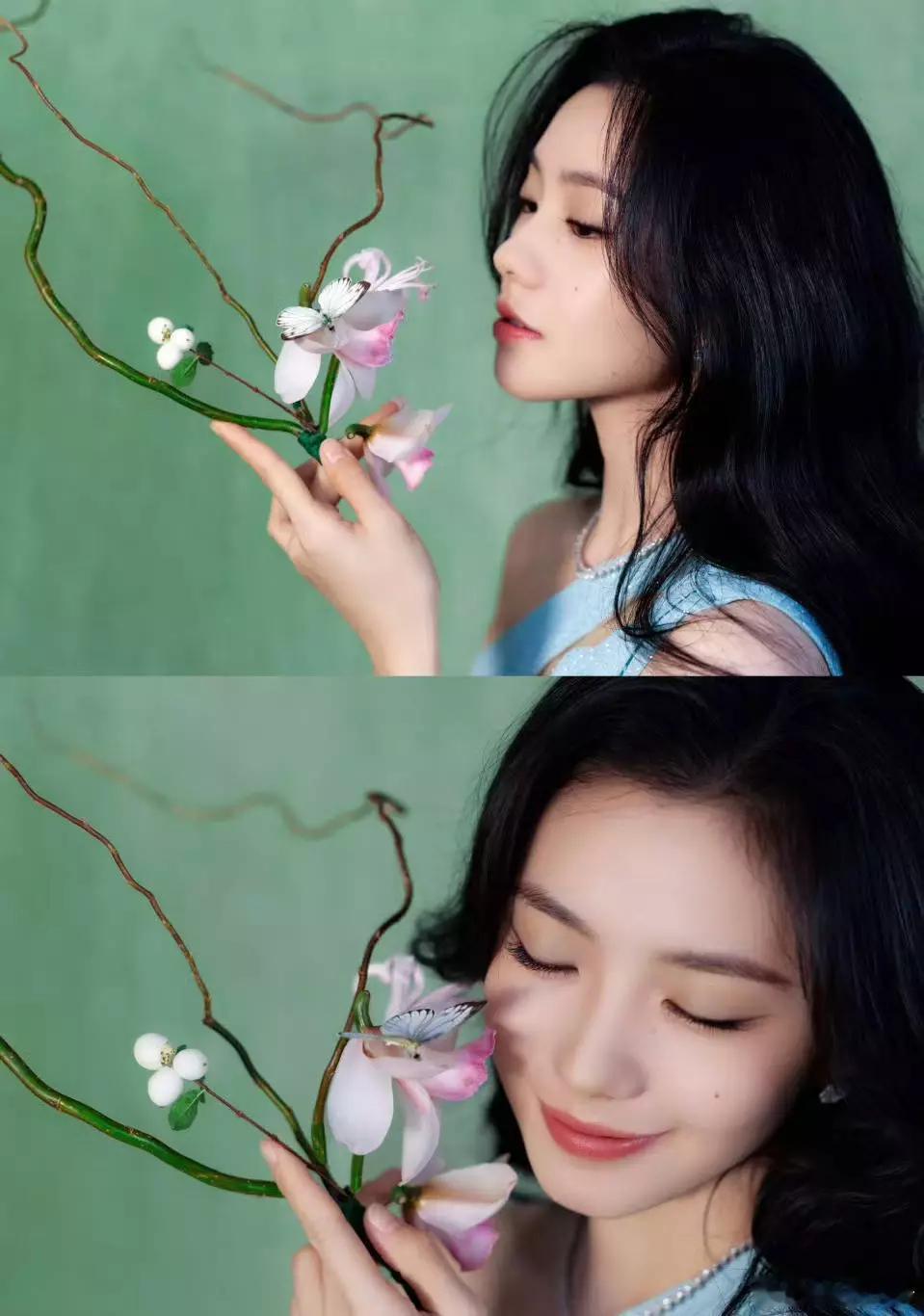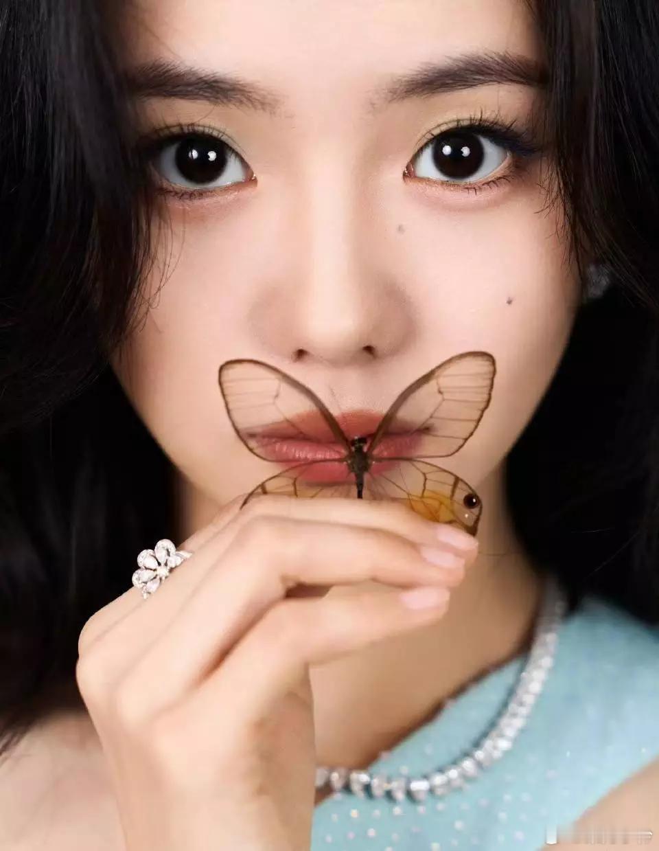 刘浩存一袭蓝裙清纯又甜美 手持蝴蝶眼神灵动