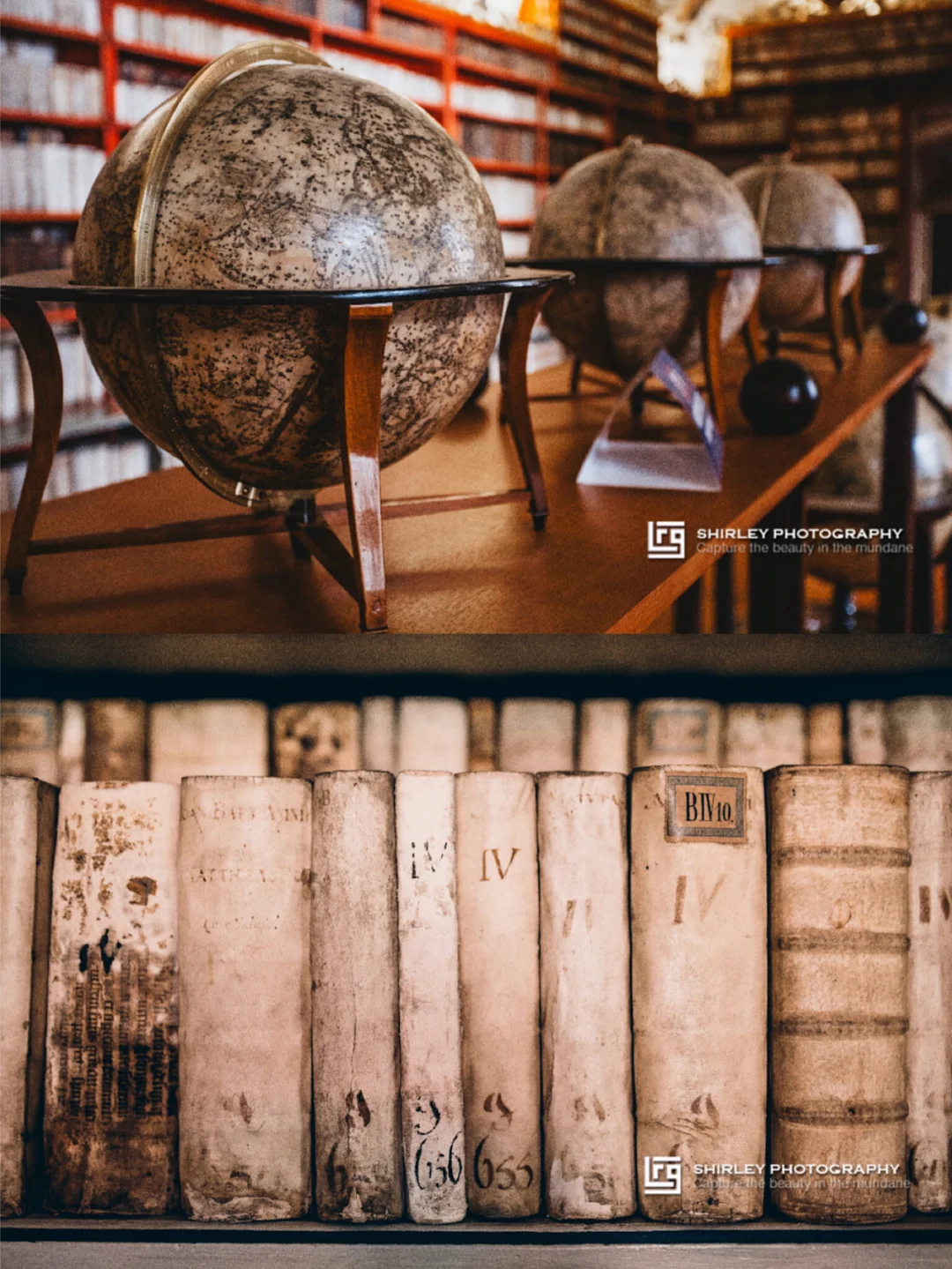 整座建筑包含了建于1794年的哲学大厅和建于1671年的神学大厅两座巴洛克式的图书馆。藏书总量高达20000册之多,且很多都是古版书。因此就算是入内参观,所有书籍都只能远远的看,不能摸也不能翻,这里的湿度和温度都是严格控制的。因为人的呼吸会破坏这些书籍的保存,所以才会控制每天的入内人数。什么动作能拍,什么不能拍,会有工作人员在一旁提醒的。不过工作人员非常有礼貌,还神秘兮兮地给我们展示了书架背后的隐藏楼梯
