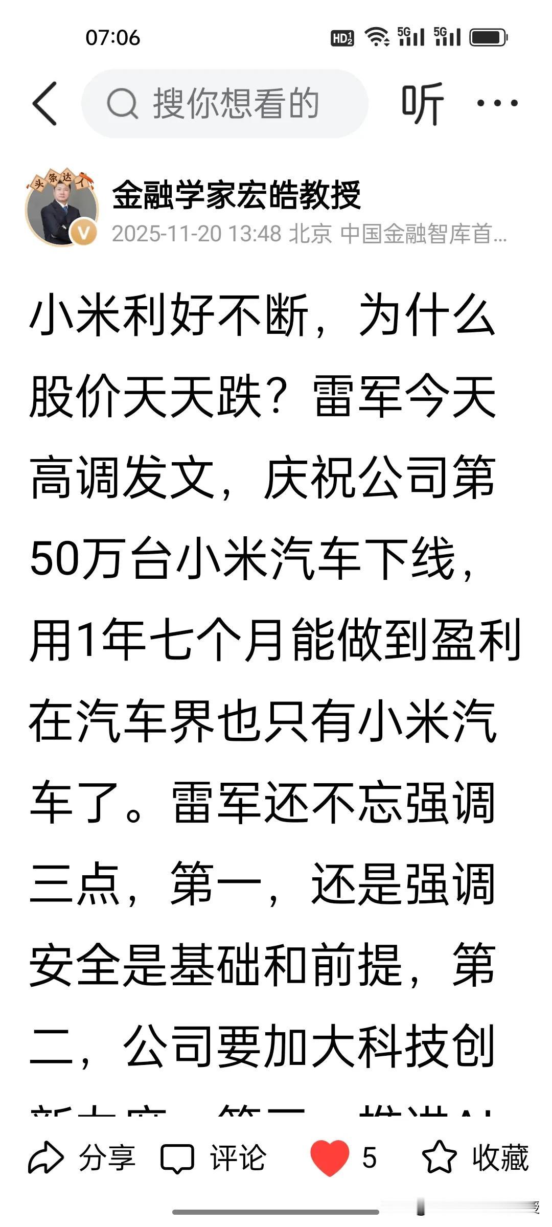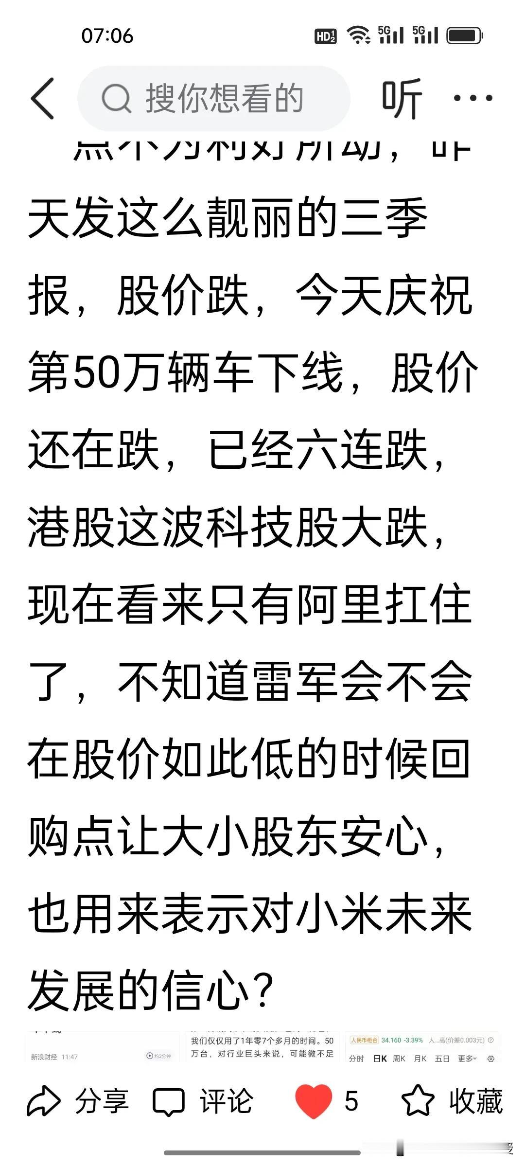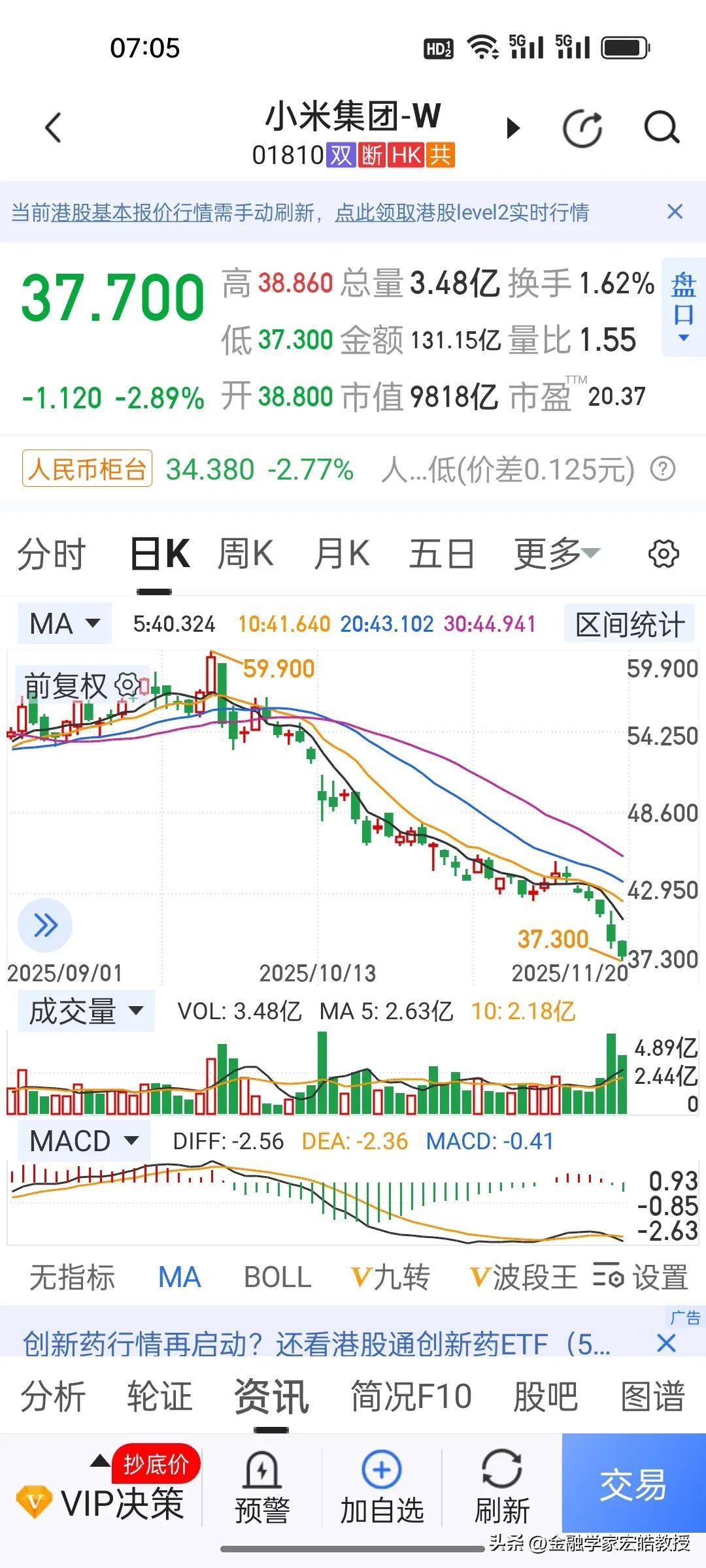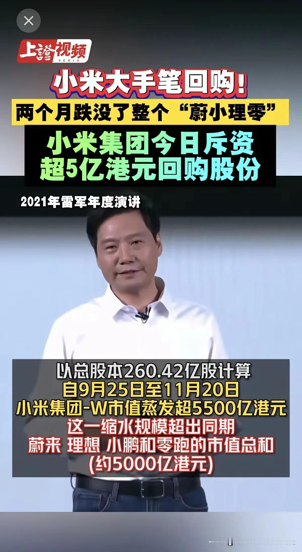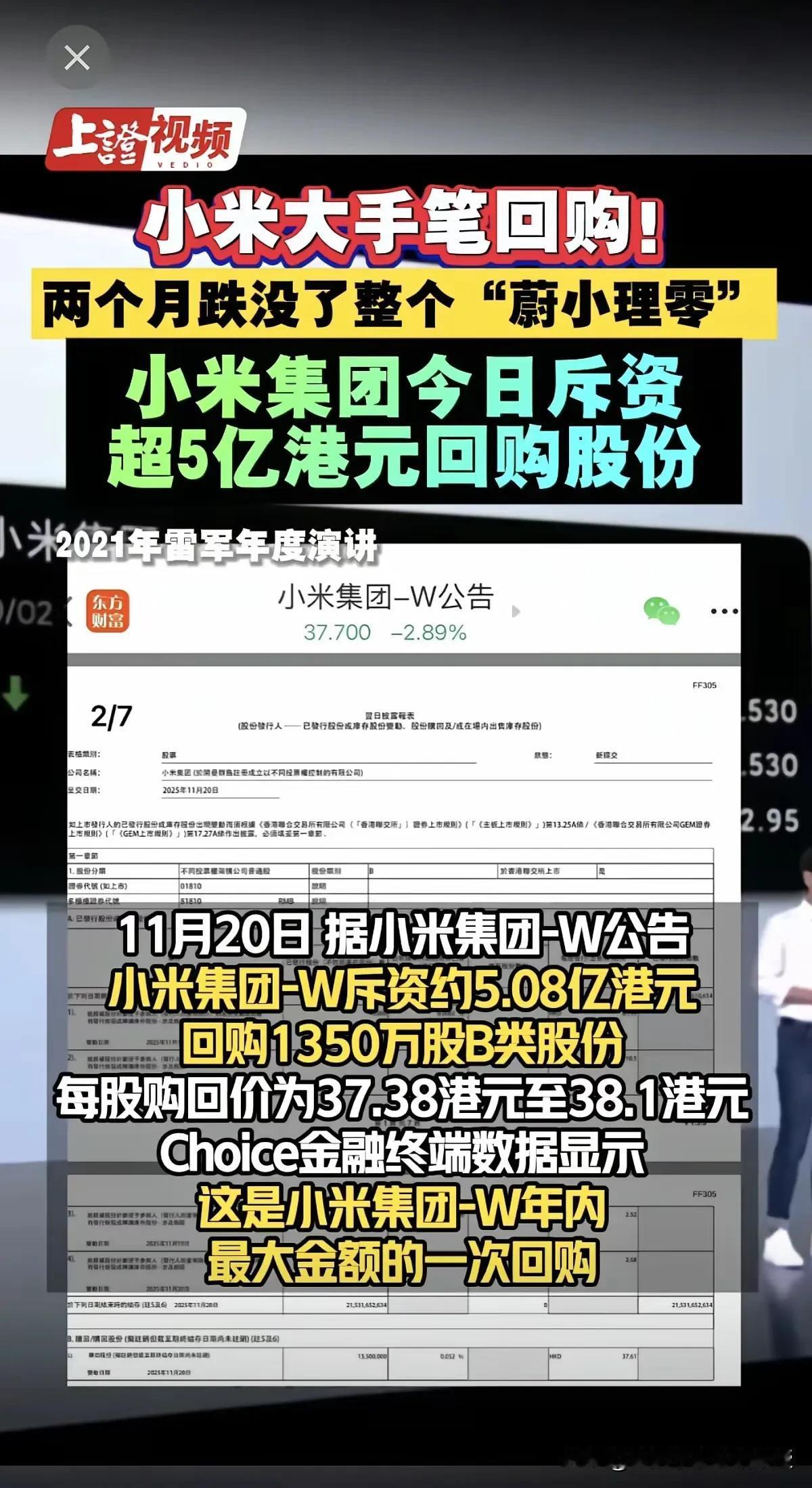 小米还是听劝啊!昨天下午我就发文建议小米在这个时候应该积极回购稳投资者了,昨晚小米发公告,已经花了5亿港元回购了1350万股来提振信心。 小米在业绩大增80%的情况下股价还连续六连跌,这个现象是极其不正常的,股价从今年9月份60元到现在已经跌去了近40%,雷军个人身价也缩水千亿,高盛之前发报告说有机构做空小米,小米在六连跌后积极回购表示依然看好公司发展前景,当前37元的低价应该就是阶段性最低点了。