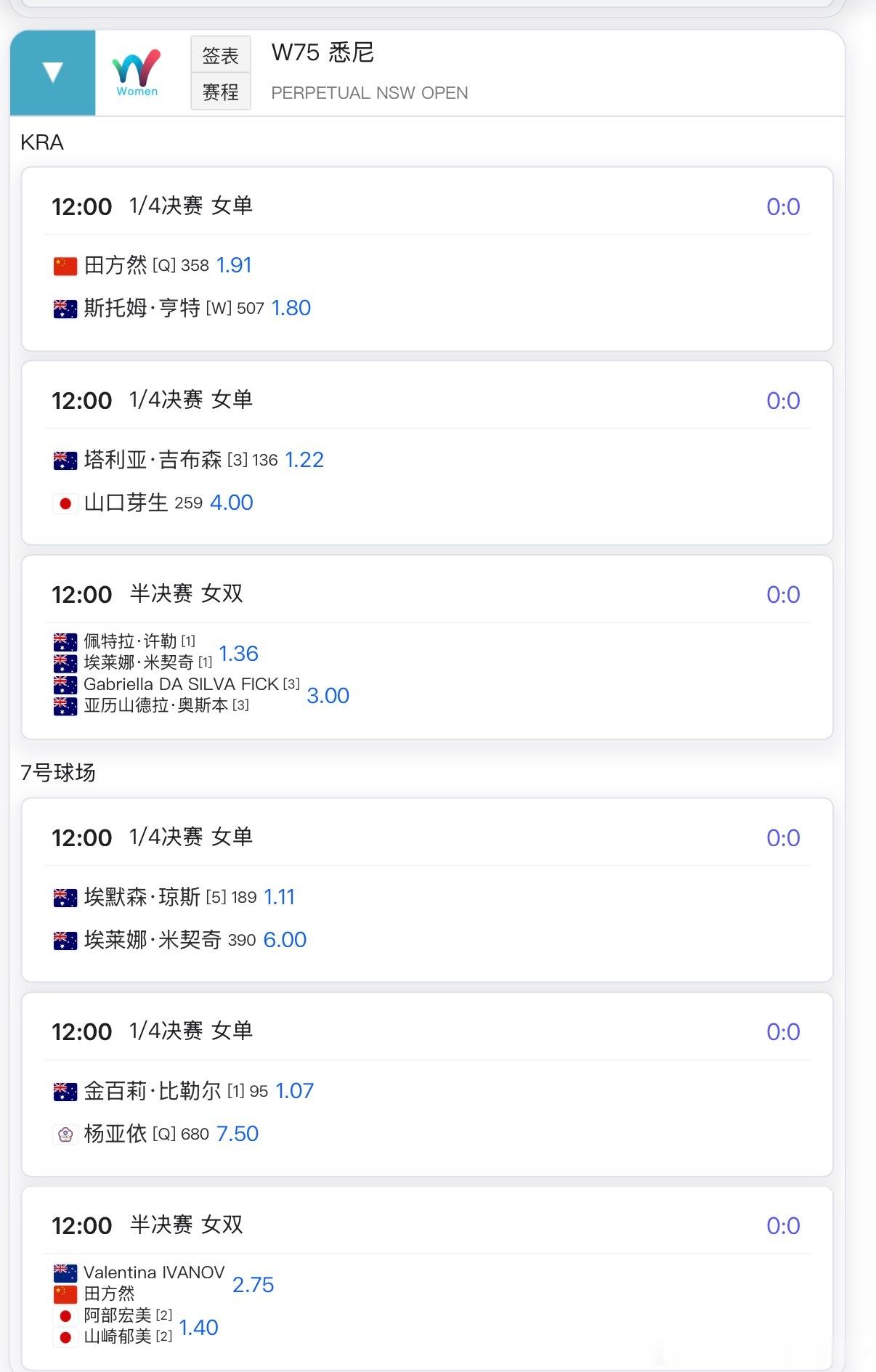 🔵W75悉尼女单1/4决赛🇨🇳田方然vs🇦🇺亨特向四强发起冲击!!!女双还将出战半决赛