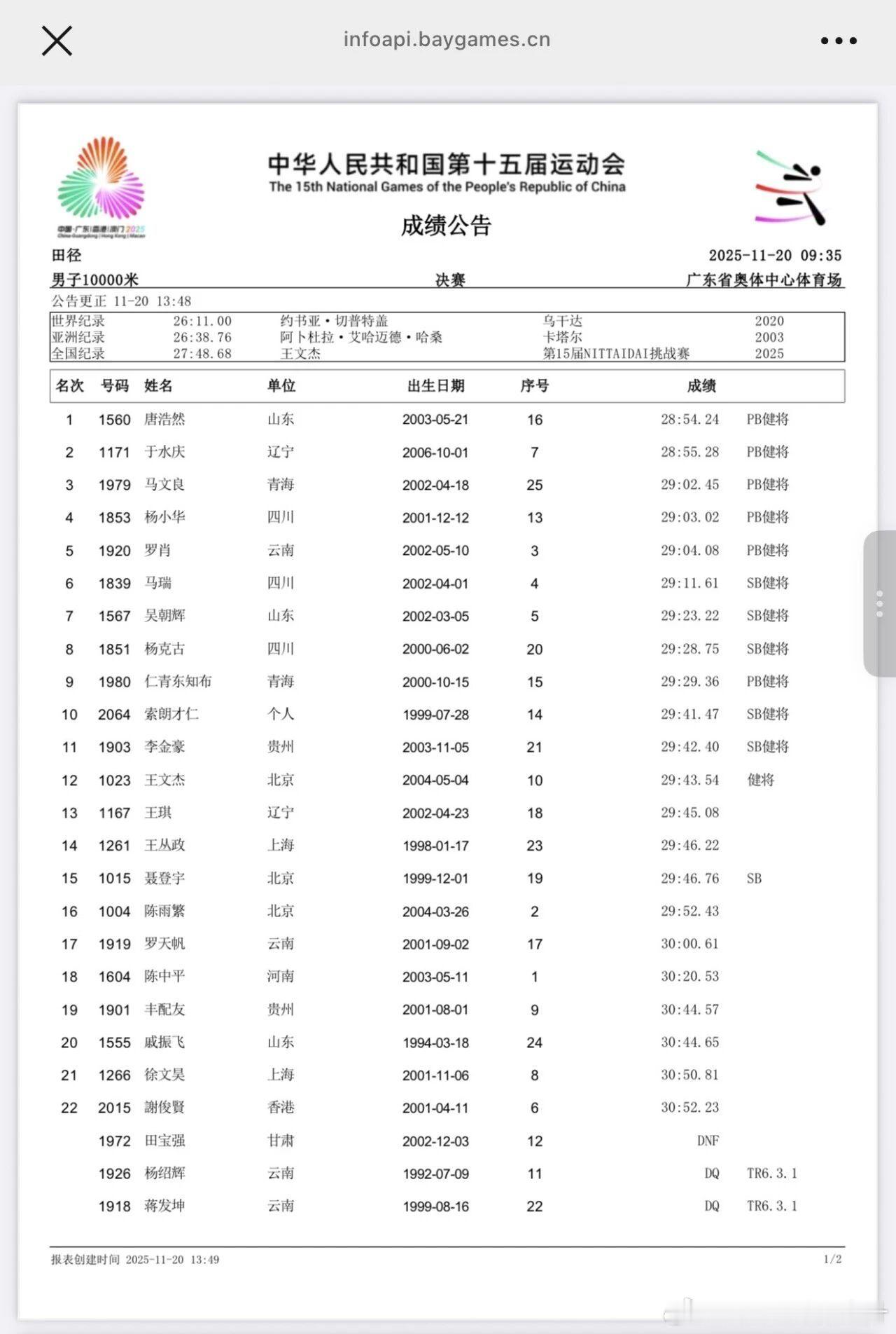十五运会官方信息平台发布成绩全运会男子10000米决赛中云南队两名选手显示DQ(取消比赛资格)备注为TR6.3.1这表明两名云南队选手的行为确实违反了世界田联颁布的田径技术准则中6.3.1条规定:接受被套圈或即将被套圈选手的领跑这种行为视为协助属于违规行为情况是当云南队的蒋发坤还剩一圈半进入最后冲刺时即将被套圈的同是云南队的杨绍辉上演二次加速带动蒋发坤极限冲刺帮助其建立了冲刺优势蒋发坤第一个冲线最终判决金牌🥇山东队 唐浩然银牌🥈辽宁队 于水庆铜牌🥉青海队 马文良
