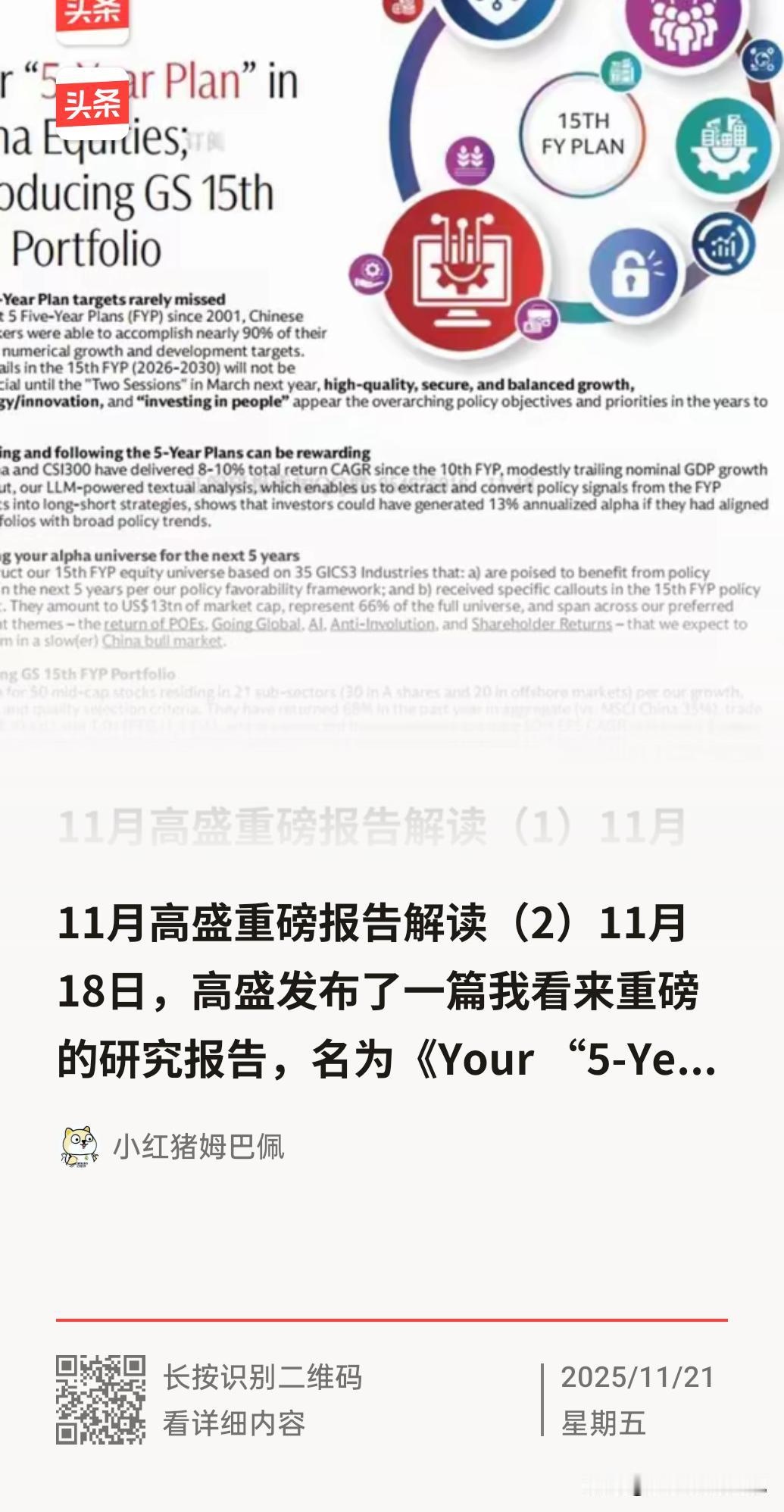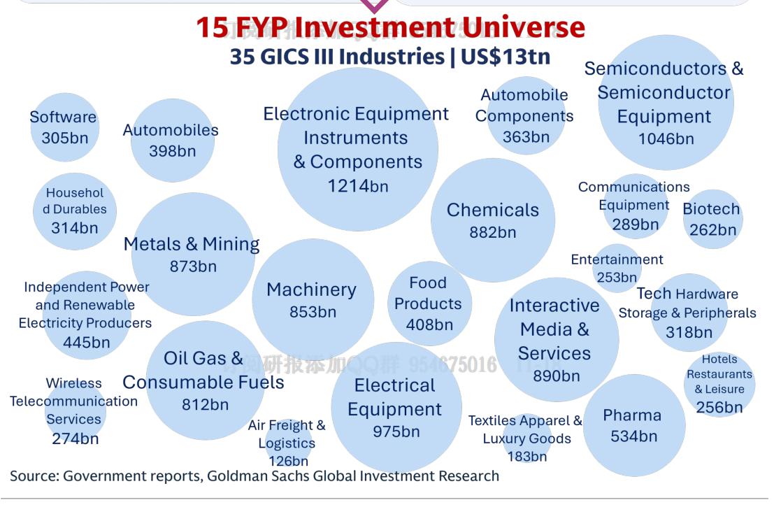 11月高盛重磅报告解读(3) 11月18日,高盛发布了一篇我看来重磅的研究报告,名为《Your “5-Year Plan” in China Equities》,可以翻译为“你在中国权益资产投资上的5年计划”,阐述了高盛视角下的中国“五年规划”与中国股市投资机遇,我分几次翻译并为大家解读该报告。这篇是第三部分,第一、二篇参考图1、2。 这篇重点再带大家看看,高盛提到的受益于十五五政策,并被其看好的35个具体的GIGS三级行业(原文见图3)是哪些: 1. 软件 2. 汽车 3. 电力 4. 金属与采矿 5. 机械 6. 食品 7. 化工 8. 汽车零部件 9. 半导体与半导体设备 10. 通信设备 11. 生物技术 12. 娱乐 13. 技术硬件、存储与周边 14. 商业与专业服务 15. 制药 16. 酒店、餐厅与休闲 17. 纺织品、服装与奢侈品 18. 独立电力生产商与能源贸易商 19. 石油、天然气与可消耗燃料 20. 电信服务 21. 航空货运与物流 22. 电气设备 23. 医疗保健设备与用品 24. 容器与包装 25. 家庭耐用消费品 26. 生命科学工具与服务 27. 交互式媒体与服务 28. 多元电信服务 29. 航空航天与国防 30. 建筑产品 31. 综合消费用纺织品 32. 综合支持服务 33. 综合市场 34. 综合水务 35. 综合消费服务 --- 关键观察与总结 从这份列表和报告中的图表可以看出,这些受益行业的特征: 高度集中于科技与高端制造:半导体、通信设备、技术硬件、软件、电气设备、机械等占据核心地位,这与“科技自立自强”的国策完全吻合。 消费与服务业占比显著:汽车、娱乐、酒店餐饮、纺织品奢侈品等行业的入选,反映了“提振内需”和“消费升级”在十五五规划中被提升到新高度。 涵盖关键战略资源:金属与采矿、化工(尤其指向新材料)是发展高端制造业和新能源产业的基础。 兼顾绿色转型:电力、独立电力生产商等行业与新能源和碳中和目标紧密相关。 剔除部分传统行业:虽然报告中未明确列出未入选的行业,但从其筛选逻辑看,一些与旧经济模式高度关联、或政策支持力度相对较弱的传统行业可能未被纳入。 这份详尽的行业清单为投资者提供了一个清晰的“政策地图”,指明了未来五年中国产业政策和资本可能重点流向的领域。