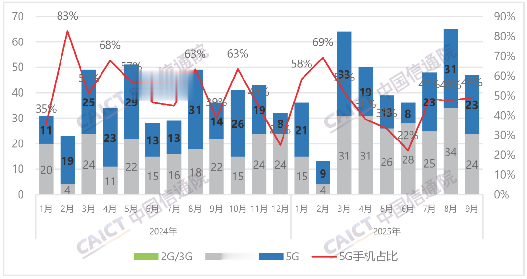 2025年9月,国内手机上市新机型47款,同比增长30.6%,其中5g手机23款,与同比增长64.3%,占同期手机上市新机型数量的48.9%。