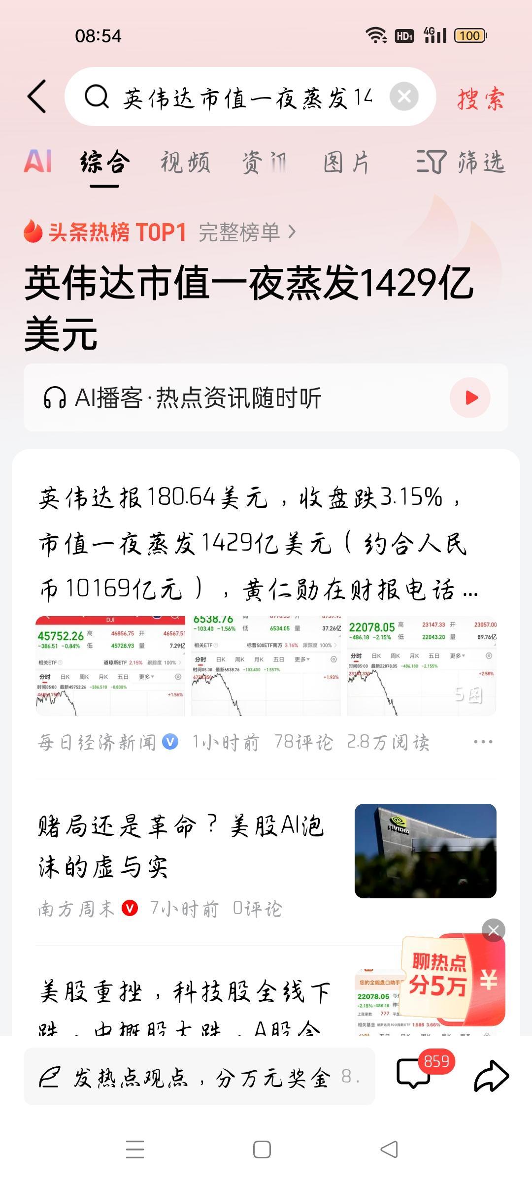 英伟达市值蒸发1429亿美元,我想说 据每日经济新闻报道,英伟达报180.64美元,收盘跌3.15%,市值蒸发1729亿美元(约合10169亿元),我想说,英伟达当天财报显示业绩好,英伟达先涨了5%,后来大盘影响,再加上对科技股泡沫的担忧,由涨转跌。我想说,美股也是变幻莫测,英伟达作为科技股龙头之一,业绩肯定是杠杠的。但是什么都有一个度,市场炒作科技股,它也要获利了结。所以不管是英伟达,还是特斯拉,都会有涨有跌,个人认为,是正常的。各位条友觉得呢?