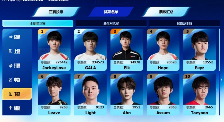 LPL全明星下路票榜:哥哥27万 GALA票数23万 第三名Elk仅2.4万票