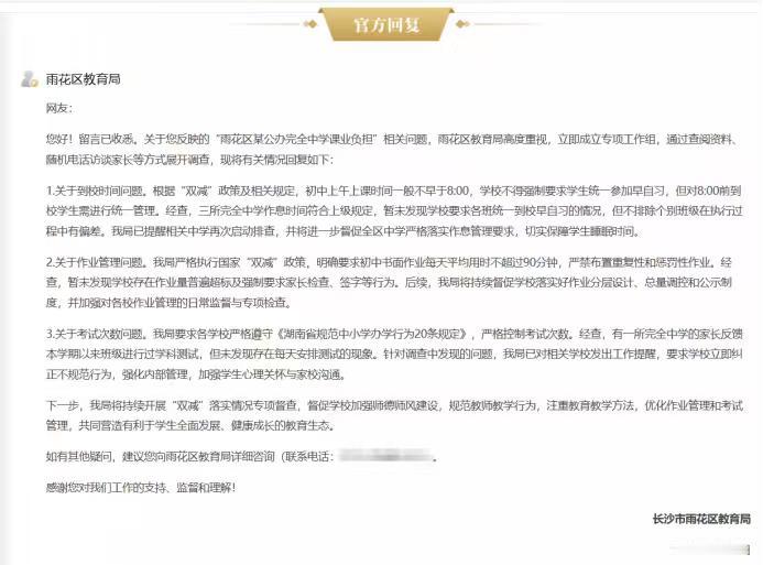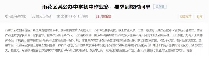 湖南长沙,某公办中学,因学生上学时间早、下学时间晚、作业量大,导致全家睡眠不足6小时,被家长投诉。 11月4日,据家长反映,他们的家孩子在雨花区一所公办普通完全中学上初一,学校要求孩子早上7:20到校,晚上放学晚,家庭作业还非常多,几乎每天要做到晚上12点以后才能做完,学校还要求家长对作业进行检查和签字,作业做不完,老师会在班级群里点名批评。 长时间这样,以对整个家庭造成了影响。因为孩子每天熬夜做作业,家长也要熬夜检查作业,导致全家睡眠不足6小时,家里老人受不了,只能给租房子住。 现在家长备受煎熬,敢怒不敢言,休息不好,孩子每天上学没精神,家长上班更没有精神。家长认为,孩子才初一,每天就安排这么多的作业,完全不符合教育局的规定。 而且学校每天都安排测试试卷,试卷难度大、题量大,还要求学生抄试卷,老师还喜欢拖堂,让孩子留校,导致孩子回家晚。 学校和老师的严苛要求,已经严重影响了孩子和家长的身心健康,对整个家庭的生活造成了极大的影响。 家长要求学校严格执行教育局的相关规定,取消早自习,合理布置作业,还孩子和家长们正常的生活作息时间。 最后在落款处,家长还表示“跪谢”!可见这位家长是真的被折磨的受不了了。 对这位家长的投诉,雨花区教育局11月7日做出了回应。教育局表示,接到投诉后,第一时间就进行了调查。 关于学生到校早的问题,教育局规定,初中学生早上上课时间不早于8点钟,学校不得强制要求学生参加早自习。经调查,学校的作息时间符合要求,不存在违规现象,只是个别班级在执行中有偏差。 关于学生作业多的问题,教育局规定,初中生书面作业每天不超过90分钟,严禁布置重复性和惩罚性作业。经调查,没有发现违规现象,也没有发现学校要求家长检查作业和签字的行为。 关于学生测试频次问题,教育局要求,严格控制考试次数。经调查,没有发现学校每天安排测试的现象。 最后,教育局还表示,对家长反映的问题,他们将持续进行监督检查,加强学校师德师风建设,规范教师教学行为,优化作业管理和考试管理,确保学生作息时间和健康成长。 对于这位家长反映的问题,好多家长表示,自家的孩子跟他们家的一模一样,晚上12点多睡觉,早上6点半就得起床,全家跟着熬夜,真的太累了。 可从教育局的回复来看,家长反映的问题没有一条成立的,学生上学时间符合要求,作业量也符合要求,更是没有要求家长检查作业和签字。这样的回复是不是太应付和敷衍了,是不是没有没有真正的深入调查,只是为了回复而回复的。 作为一个初一的学生,就要求这么苛刻,上了高中怎么办?如果一直这样下去,初中和高中六年下来,对孩子的身心健康肯定影响很大,对家长来说也是煎熬。 现在教育太卷,老师和学校为了出成绩,就一直压缩学生的休息时间,安排大量的作业,导致孩子睡眠不足,全家人也跟着受罪。有些学生上了高中,头发都熬白了,看着都不像青少年的样子。 如果学生每天休息不好,上课也就没精神,反而导致学习效率下降,适得其反。所以说,科学规律的教学和作息,对学生来说是非常重要的,它不仅可以提高学习效率,还可以保证学生的身心健康。 如果因为学习,把学生的身体熬垮了,一切都白搭。因此,相关学校还是要重视家长所反映的问题,合理安排学生的作息时间和作业量,保证学生有充足的睡眠,同时也减轻家长的负担,这样才能更好的提高学习效率。教育 作业