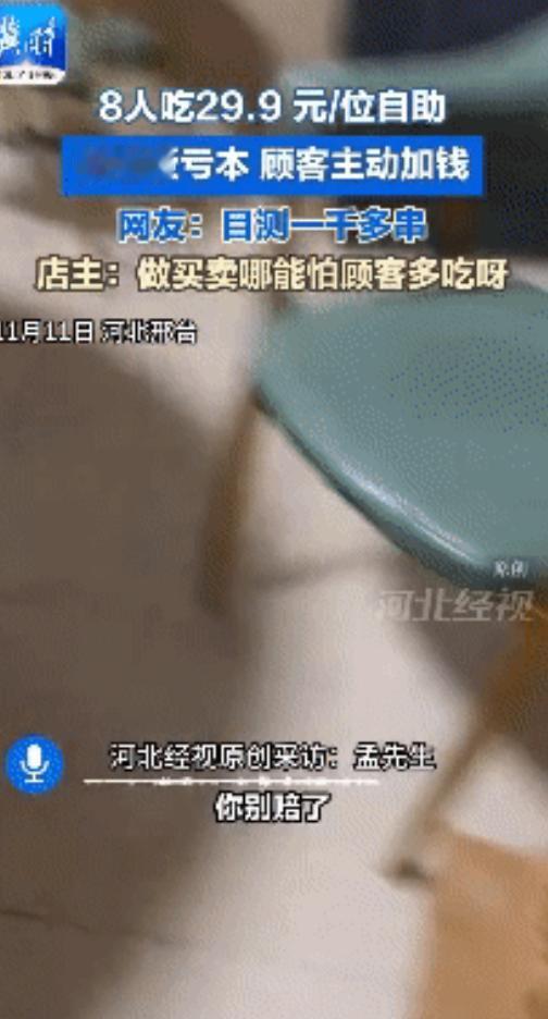 “骨子里的善良!”11月15日,河北邢台,8人去吃29.9元一位的自助火锅,众人大约吃了1000根串串,担心把老板吃亏本了,其中一名男子主动要求多付点钱,没想到老板也很实在,表示做买卖的哪能怕顾客多吃!网友:都是讲究人! 11 月 15 日的河北邢台,夜色一浓,街头的烟火气就跟着旺了起来。孟老板开的那家自助火锅店,门头不算起眼,却凭着 29.9 元一位的实惠价格和新鲜食材,成了附近街坊晚上解馋的好去处。 这天晚上店里来了八位特别的客人,都是体格健硕的大哥,看着就豪爽实在,谁也没想到这顿饭会因为 “骨子里的善良”,成了全网热议的暖心事。 八位大哥进店后,没多啰嗦直奔 29.9 元的自助套餐,选了个包厢坐下,刚一落座这场 “硬核干饭” 就拉开了序幕,自助火锅的乐趣,本就是敞开了吃,但这几位大哥的战斗力,还是超出了预料。 锅底烧开后,红油翻滚着冒泡,大哥们一把接一把地往锅里下串串,肉串、菜串轮番上阵,转眼间,桌上的空签子就堆成了小堆。 随着时间推移桌上的签子越积越多,普通的盘子根本装不下,大哥们干脆拉过一个空啤酒箱,把签子一根根插进去,到最后箱子里的签子密密麻麻堆成了小山,看着都让人惊叹。等他们酒足饭饱起身结账时,孟老板去清理包厢,一数签子着实被惊到了,足足将近 1000 根! 按常理说29.9 元一位的自助,吃掉 1000 根串串,老板大概率是要亏本的,换作别的店家,可能早就皱起了眉头,甚至暗自盘算着下次怎么限制这类 “大胃王”,可这八位大哥的反应,却完全颠覆了常见的消费逻辑,他们结完账走到店门口,其中一位大哥突然折返回来,手里攥着好几张百元大钞,脸上带着点不好意思的憨厚。 原来大哥们吃的时候就心里有数,觉得自己吃的量实在太多,29.9 元一位的价格,老板肯定亏大了,都是挣辛苦钱的,他们实在不忍心让孟老板白忙活一场,所以特意回来想多付点钱补贴一下,这种吃了饭主动要求加钱的事,孟老板做餐饮这么多年,还是头一回遇上当场就愣在了原地。 面对大哥递过来的钱,孟老板缓过神后,立马坚决地推了回去,他的想法特别实在开门做买卖,本来就有赚有亏,遇到饭量小的顾客,自己也没想着退钱,那遇到能吃的朋友,自然也不能额外收费,29.9 元的价格是自己定的就得认这个账,“怕客人吃” 这话压根就不该是生意人说的。 大哥们见孟老板态度坚决实在不肯收钱,心里更过意不去了,他们觉得孟老板这么实诚,自己不能让人家吃亏,可钱又送不出去,一时间还有点局促。 这时候孟老板灵机一动,笑着提议:“要不你们帮我拍个视频吆喝两句?” 大哥们一听立马点头答应,站在堆满签子的啤酒箱旁,对着手机镜头实打实夸赞起来,说店里的串串新鲜、老板实在,29.9 元吃得特别值。 这段没有华丽剪辑、全是大实话的视频,被孟老板传到社交账号后,没想到一夜之间就火了,网友们被这双向奔赴的善意彻底打动,评论区里满是 “都是讲究人”“骨子里的善良藏不住” 的留言。 大家纷纷点赞八位大哥的共情与厚道,他们没有觉得 “付了钱就能随便吃”,而是体谅老板的不易,主动想弥补;更佩服孟老板的诚信与坦荡,没有因为顾客吃得多就变脸,坚守着做生意的本分。 很快孟老板的小店就成了网红打卡地,不少人特意慕名而来,就想尝尝这让 “讲究人” 都点赞的自助火锅,而孟老板也没借着热度涨价,还特意在门口贴了张告示:“不管吃多少,都是 29.9 元,放心吃,管够!” 他用最朴实的方式,接住了这份突如其来的流量,也守住了自己的初心。 在这个总有人抱怨 “生意不好做”“人心复杂” 的时代,这桌 29.9 元的火锅,却让我们看到了最动人的模样,最好的买卖关系从来都不是冷冰冰的金钱交换,而是你懂我的不易,我成全你的豪爽。 这八位大哥和孟老板,用行动证明了 “骨子里的善良” 最值钱,也让我们明白,真诚与厚道,才是人世间最管用的 “招牌”,网友们说的 “都是讲究人”,大概就是对这份双向奔赴的善意,最贴切的夸赞吧。 (信息来源:河北经视)