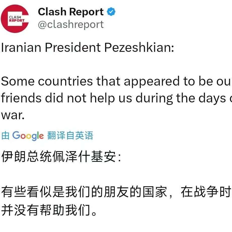 11月21日,伊朗总统佩泽什基安发牢骚称:“有些看似是我们的朋友的国家,在战争时期并没有帮助我们。” [机智]佩泽什基安很沮丧,玻璃心碎一地,他的抱怨堪称现实版盟友滤镜破碎记,满是自食其果的讽刺,所谓朋友的缺位,根源是伊朗多年来功利性的同盟逻辑——盟友危难时只隔空呐喊、只给道义支援、不给实质助力,甚至为利益与他国结盟寒了伙伴的心。 抵抗轴心的集体沉默早已说明一切:真主党遭重创时未获预警,哈马斯濒临瓦解时援助寥寥,盟友们早已看清这是交易而非情义,如今伊朗身陷困境喊没人帮,才猛然想起了盟友,没有互利共赢的真心,只谈利益捆绑的友谊,注定在危难时刻分崩离析!