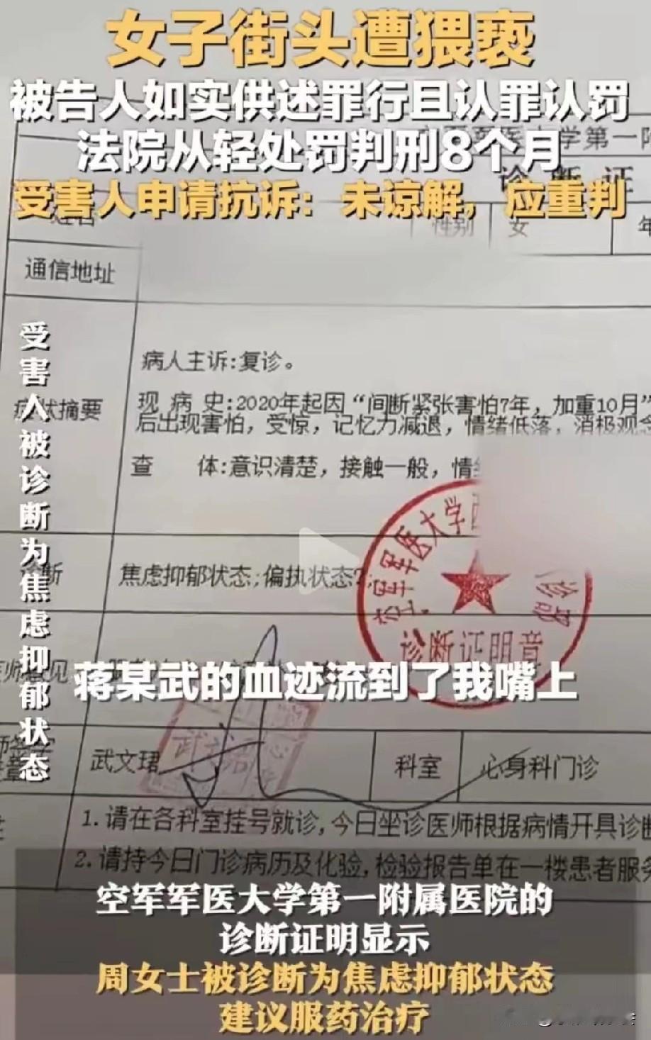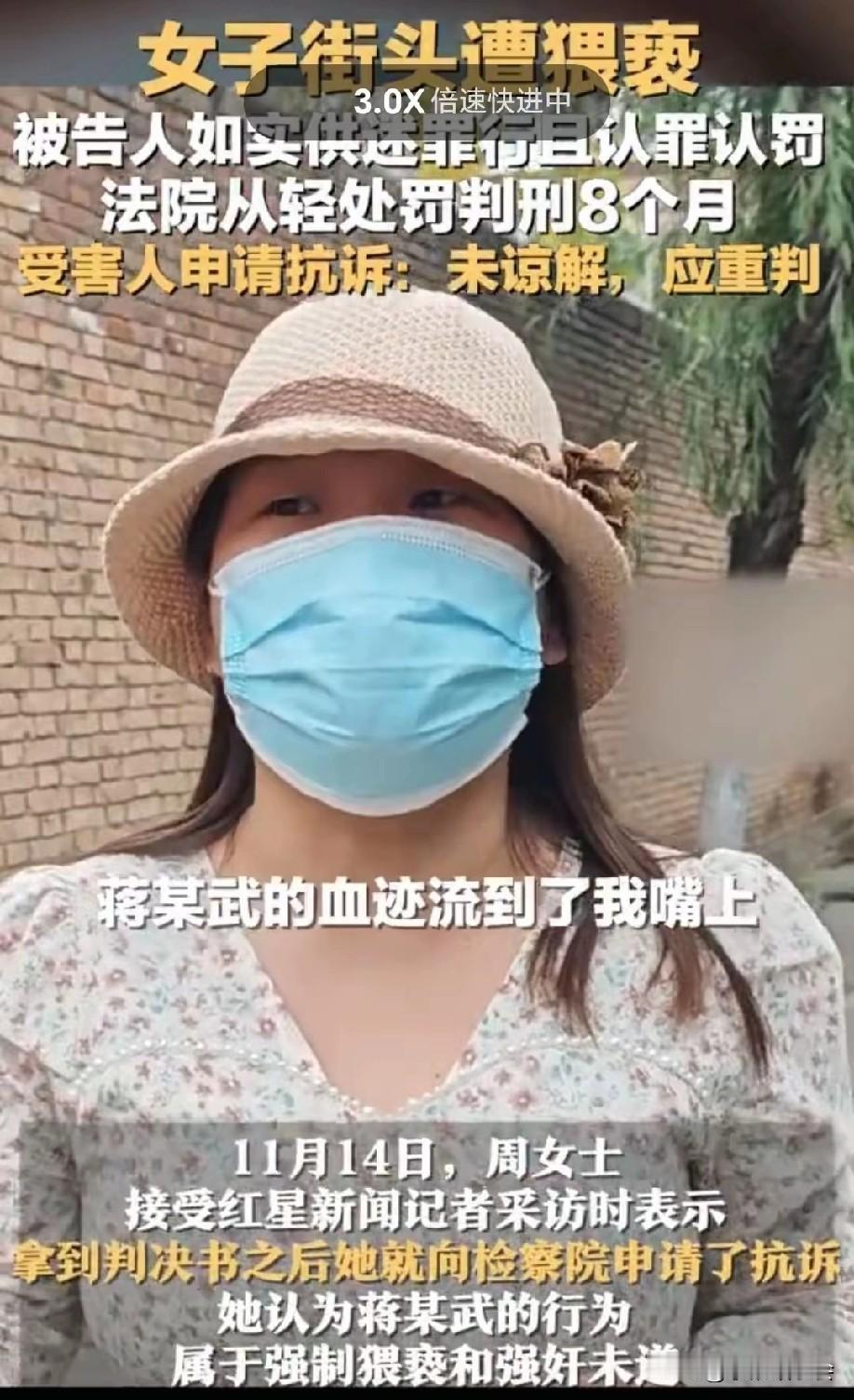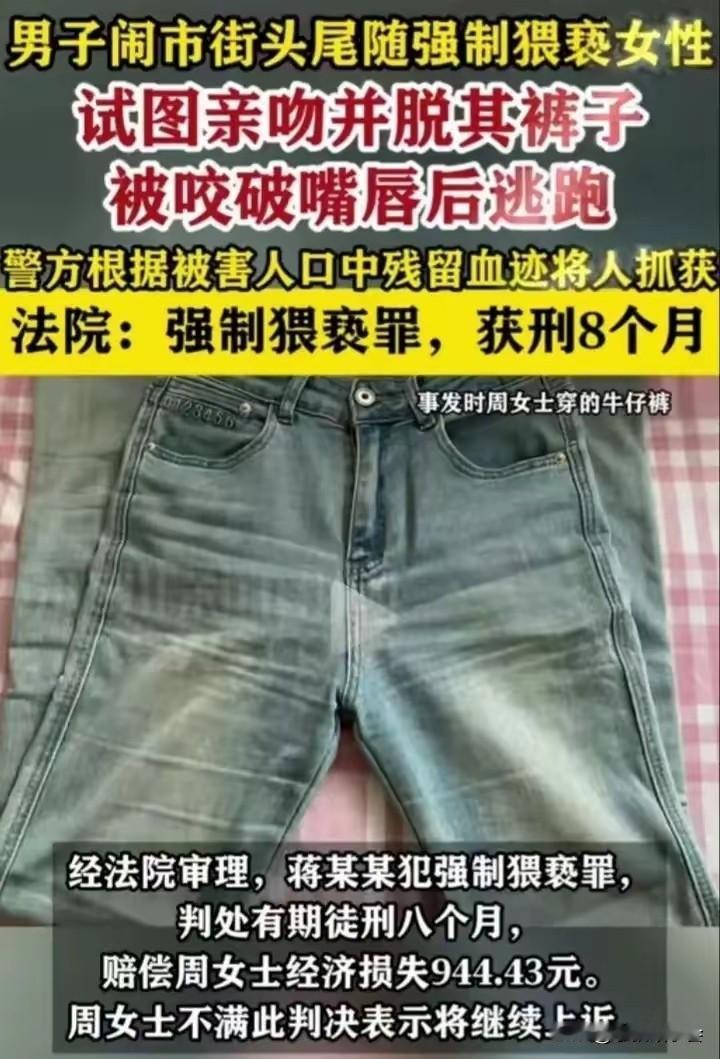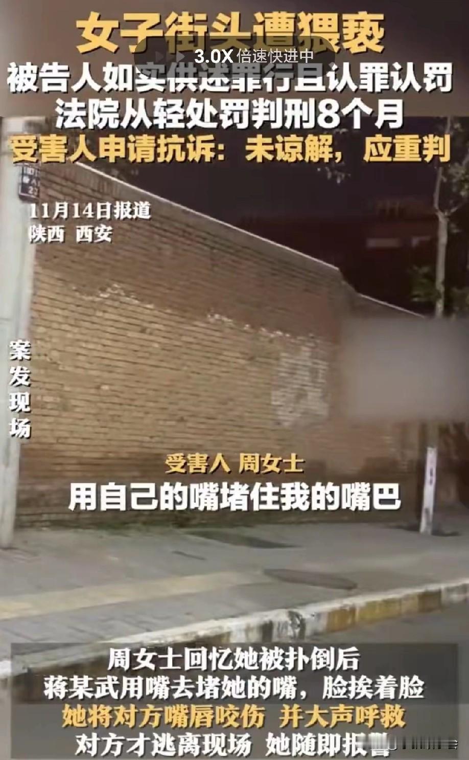 近日,西安的周女士收到了法院的判决书,对其强制猥亵的男子被判处了八个月的有期徒刑,周女士感觉法院判决太轻,表示将继续上诉。 2025年3月31日晚九时许,周女士独自一人走在街头,被告人蒋某某尾随近百米,突然将周女士扑倒在地,并骑在身上将周女士控制住。 周女士一直挣扎,蒋某某强行亲吻其嘴部,并试图脱其裤子。周女士咬破武某某嘴唇后,大声呼叫,武某某见控制不住场面,便仓皇逃离。 周女士咬破了嫌疑人的嘴唇,留下来关键证据,警方很快就将蒋某某抓获归案。 周女士现在对法院判决不服,认为法院判决过轻。 根据起诉书描述的案情,周女士认为应当按强制猥亵罪和强奸罪追究被告人的刑事责任。 从该案来说,蒋某某选择深夜时间尾随被害人,在犯罪过程中有脱被害人裤子的动作,明显带有强奸意愿,而法院以强制猥亵罪追究其刑事责任,明显有点不妥。 强奸未遂时,行为人往往实施了猥亵(如抠摸、搂抱等),但因意志以外原因未能完成性交。此时,如果主观目的明确是强奸,整体行为以强奸未遂论处,猥亵行为被吸收。 强制猥亵被强奸罪吸收是常见情形,而“强奸罪被强制猥亵罪吸收”在司法实践中极为罕见,几乎不存在。 所以,该案以强制猥亵罪定性是否准确?猥亵 猥亵要判刑 醉酒性骚扰 妇女猥亵 上海猥亵事件 地铁男子猥亵 上海猥亵男