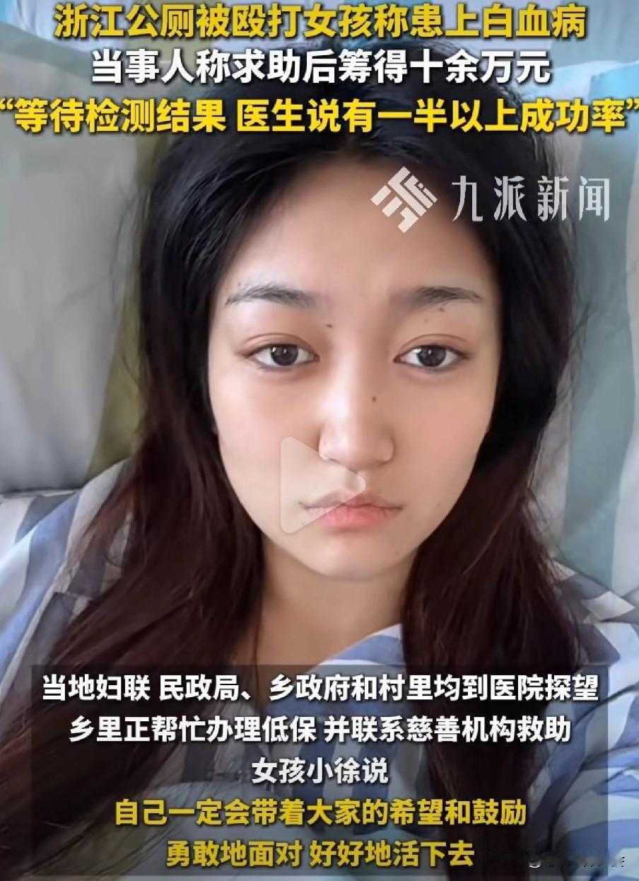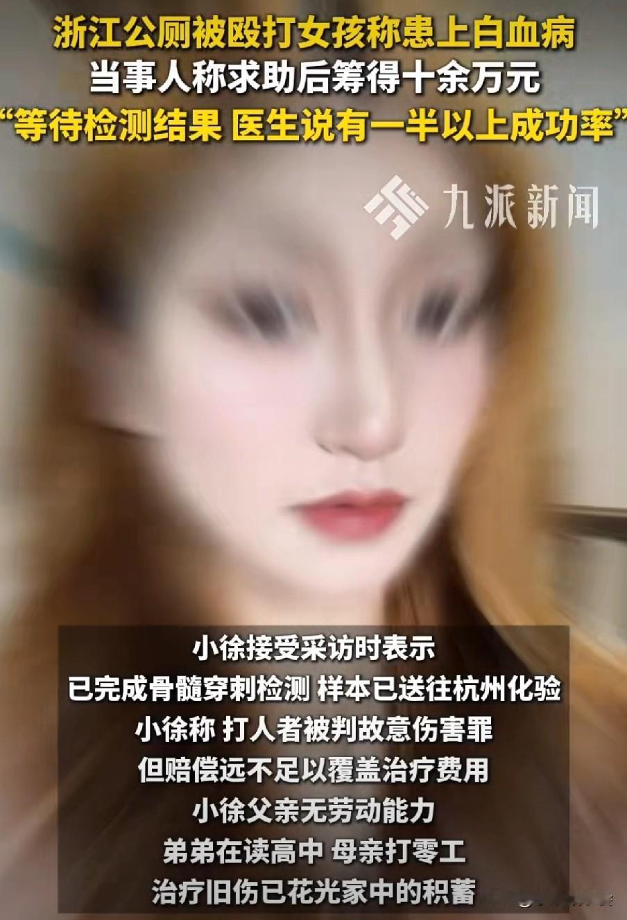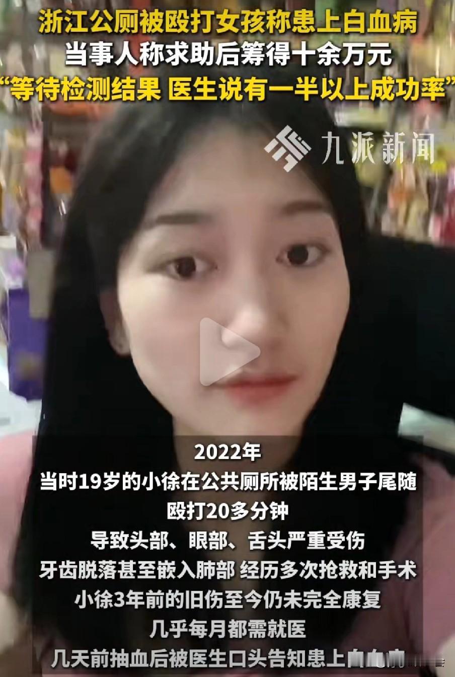 “麻绳专挑细处断,厄运专找苦命人。”这三年来,一直阳光乐观的19岁女孩小徐,在上公厕时见到了自己一辈子都不想提及的那个人。(素材取材于@九派新闻 ) 2022年10月30日,小徐被19岁的男子俞某尾随了近20分钟,行至浙江永康公厕附近,俞某开始暴力击打小徐,小徐致头部重伤、牙齿嵌入肺部。被殴打导致其右眼视力仅剩0.04,并留下持续性头痛、外力性斜视等永久损伤。 比受伤害更让人心寒的,当事情发酵到网络上,一些网友却纷纷指责小徐,说小徐是因为衣着暴露,才受到的如此伤害。小徐很快回应,我没有衣着暴露,我也不认识他! 后来俞某被判刑,俞某家人并没有负担小徐的医疗费,只象征性拿出了2万元。小徐的家庭也非常贫困,父亲肝硬化,没有劳动能力,母亲也患有疾病,靠打零工挣钱,家里还有一个正在上学的弟弟!为了给小徐治病,家里几乎花光了所有积蓄。 2025年11月中旬,苦命的小徐被确诊为白血病。“我不想死,让我多活一天也行!”小徐面对媒体,说出来自己强烈的求生欲望。 小徐妈妈说“如果可以,我愿意拿自己的命换我女儿的命!” 她也没有做错了什么事,唯一做错的事,可能就是在错误的时间和地点,碰到了错误的人……! 现在公众已向小徐捐款了十多万块钱,但离前期的收入费用40-50万还有一些差额,希望广大网友能够帮帮这位苦命的年轻女孩,毕竟她才22岁。一生的苦命人 天道不助苦命人 苦命人生活记录 男奋斗中苦命人 苦命男孩 孩子苦命 读书苦命