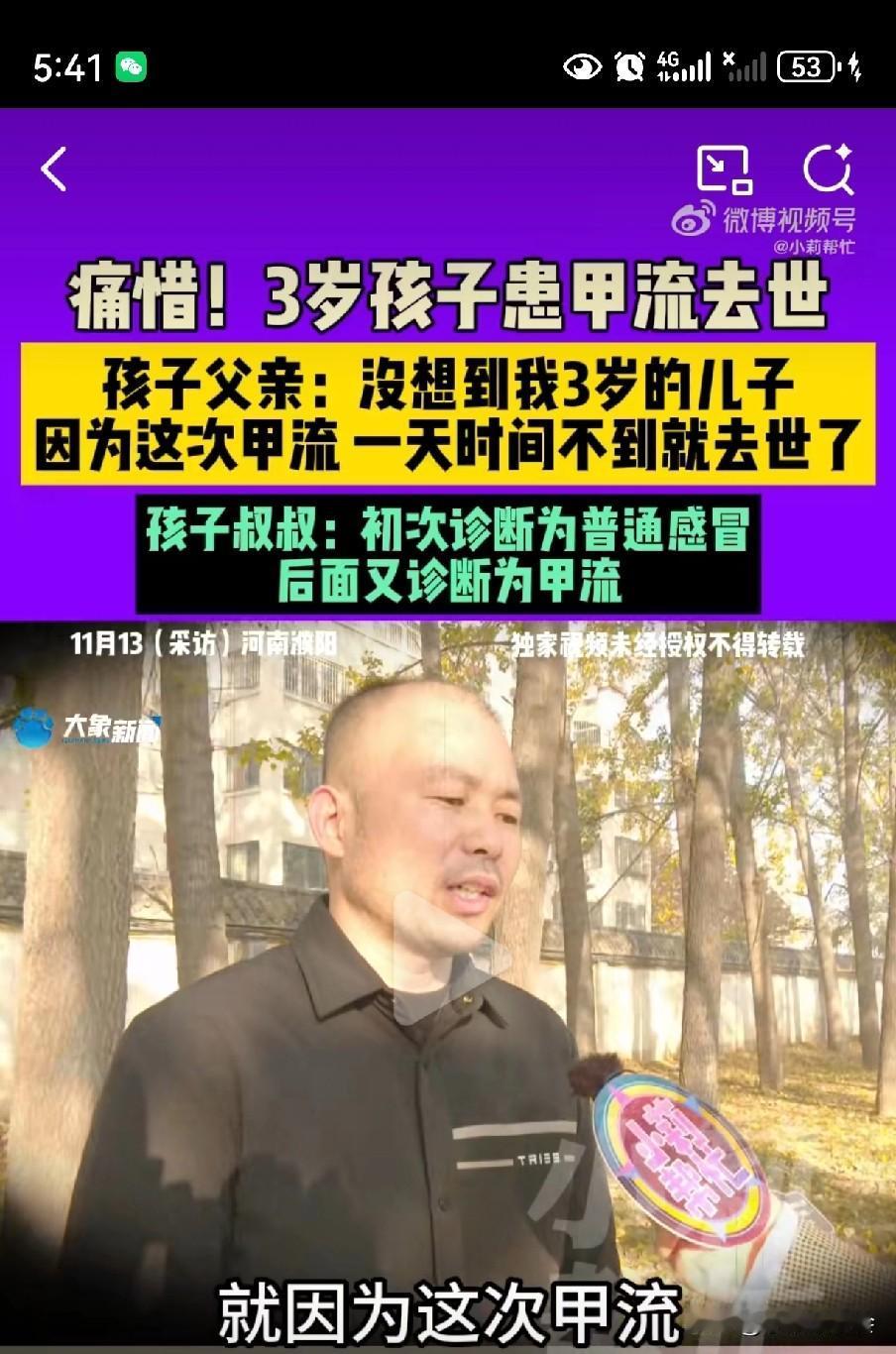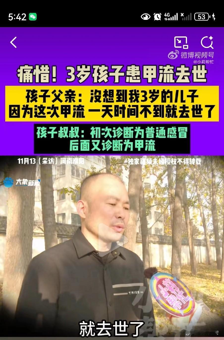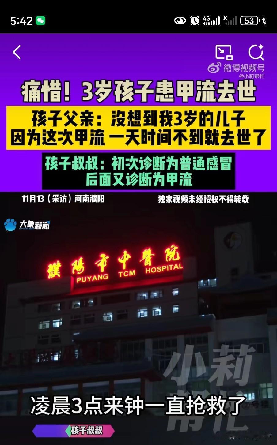 真让人心痛!濮阳3岁儿童患甲流,不到一天时间就因抢救无效死亡了。 11月10日