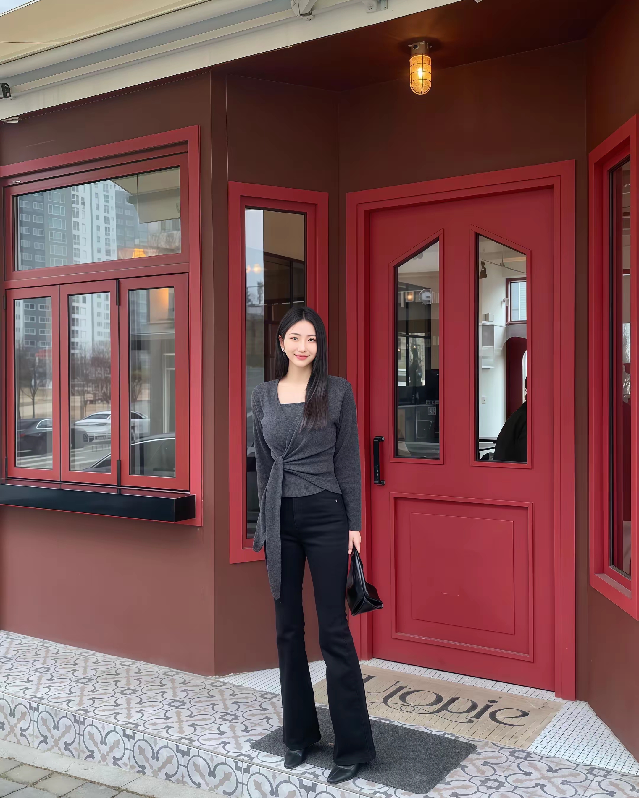 优雅黑衣女子,站在红色门前的时尚瞬间,气质高雅端庄靓丽