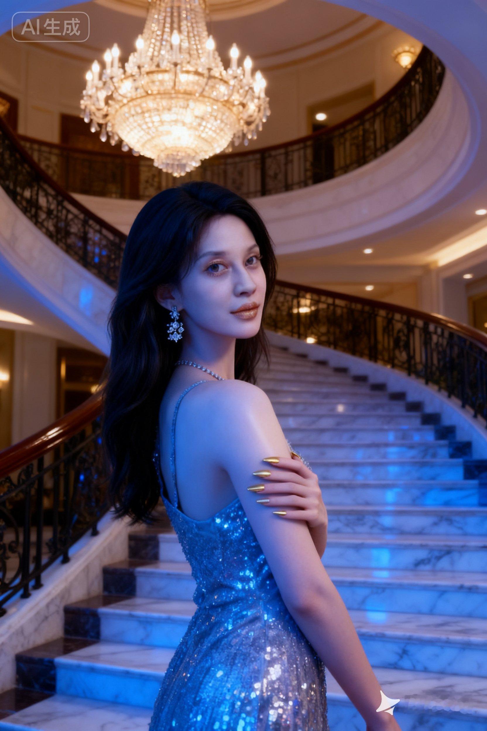 程潇,优雅黑裙穿搭,复古楼梯背景,手提包点缀,尽显时尚魅力!
