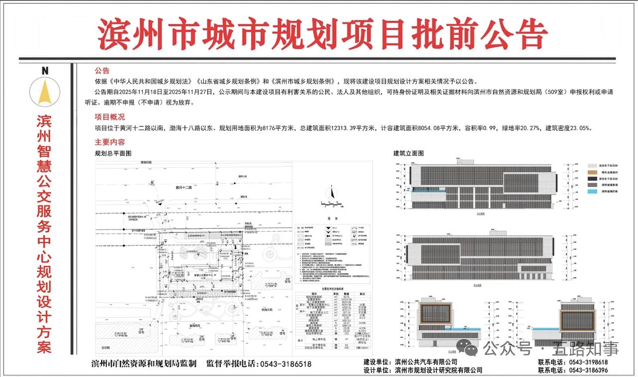 定了!就在滨州黄河十二路! 11月18日,《滨州智慧公交服务中心规划设计方案》公布:(图一图二) 山东滨州智慧公交服务中心项目位于黄河十二路以南,渤海十八路以东。规划用地面积为8176平方米,总建筑面积12313.39平方米,计容建筑面积8054.08平方米,容积率0.99,绿地率20.27%,建筑密度23.05%。 该项目位于滨州富海观岳小区的正北侧。该中心的出入口位于项目西北角(望海花园南门正对面)。 建设单位为滨州公共汽车有限公司。 来源:滨州市自然资源和规划局
