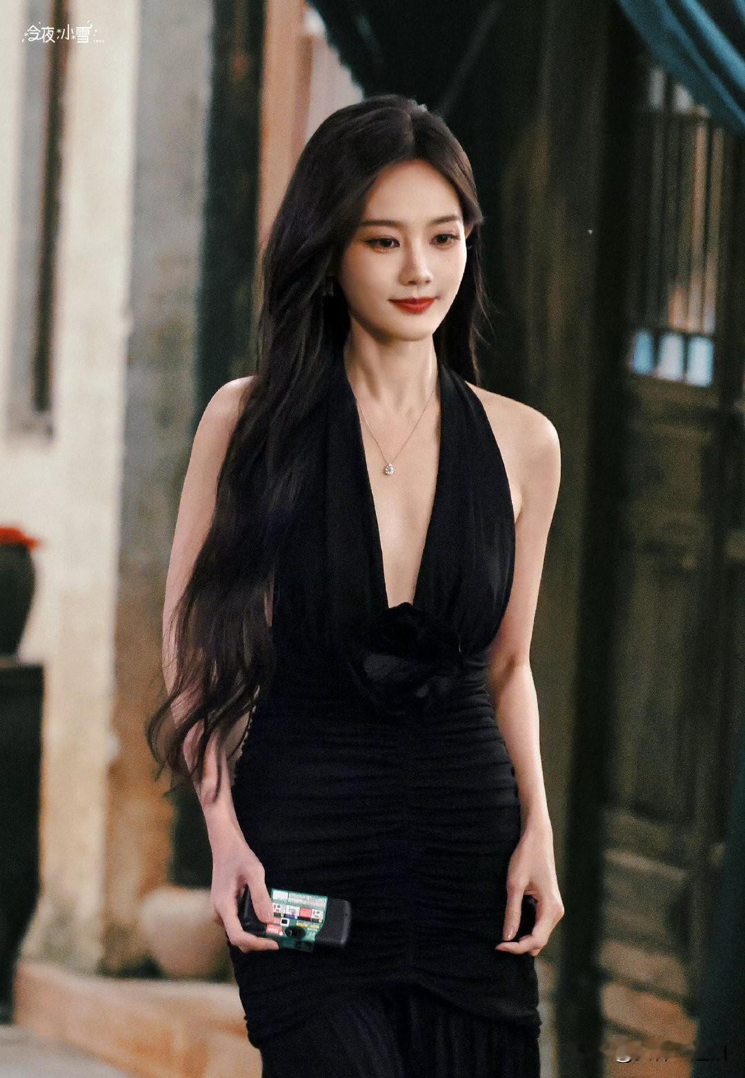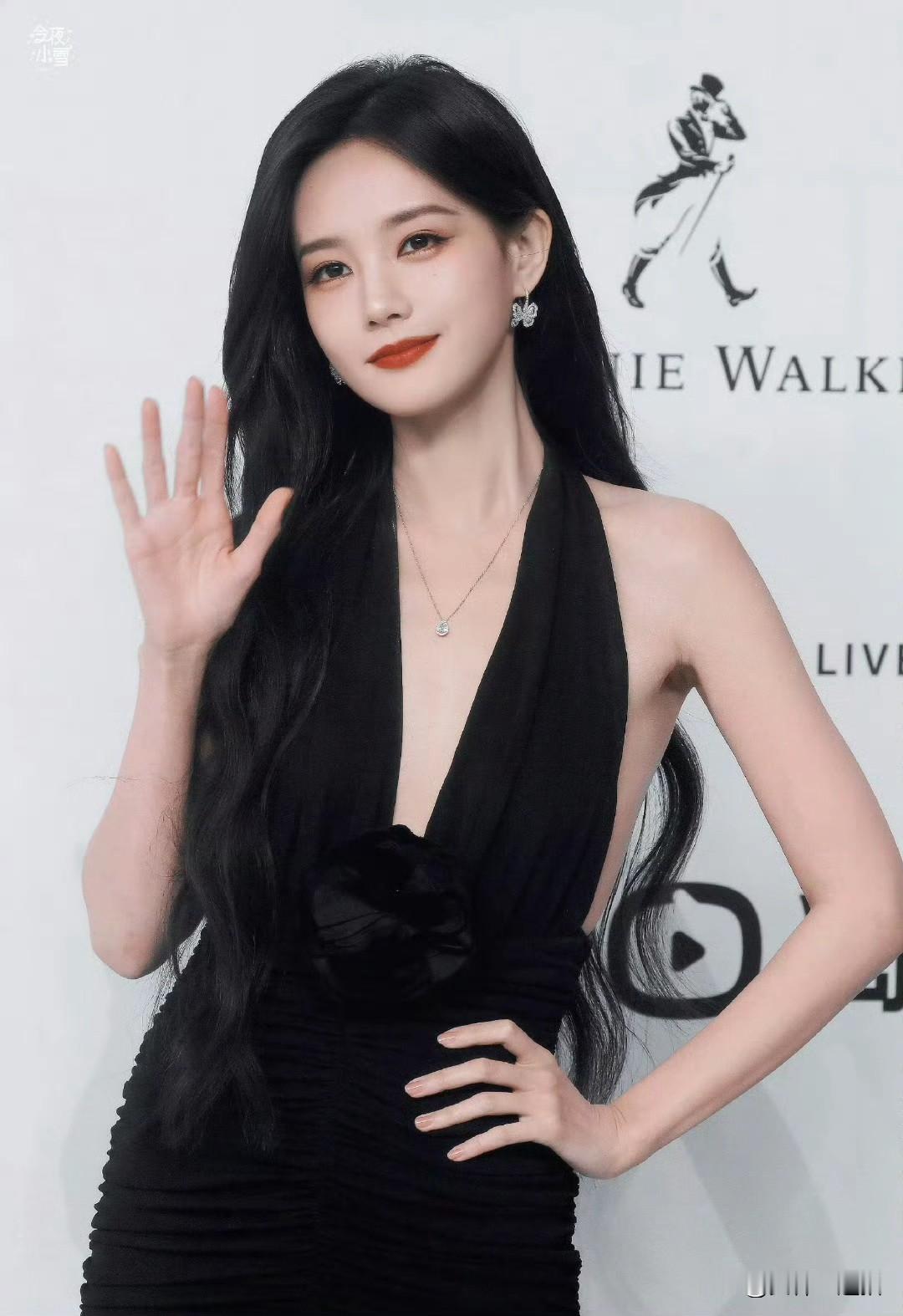 美女 优雅黑裙女神,红唇微笑,气质满分!