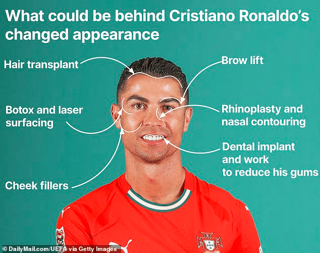 他的评估中,C罗40岁了,但他的下眼睑、脸颊和额头看起来却非常完美,这很可能意味着这位国际足球明星注射过肉毒杆菌来去除面部上方的皱纹和鱼尾纹,外科医生解释道。