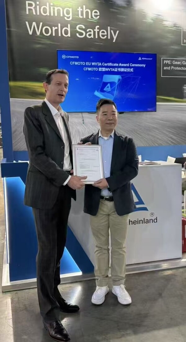 展会期间,TÜV莱茵为浙江钱江摩托股份有限公司摩托车(型号PE0)、浙江春风动力股份有限公司摩托车和全地形车(型号CF700-9AH和CF1000AU-4L)、西藏新珠峰摩托车有限公司摩托车(型号KY800X-B)、赛格威科技有限公司摩托车(型号SGW500F-A7)、广东大冶摩托车技术有限公司摩托车(型号ZT700-I)颁发了卢森堡交通部签发的WVTA证书,为79BIKE两轮电动摩托车(型号DH2000DY)颁发匈牙利交通部签发的WVTA证书,为云通达(深圳)人工智能有限公司电动滑板车(型号H11)颁发德国交通部签发的ABE证书。获颁证书表明这些产品的安全性与合规性已达到欧盟准入要求,为其进入欧盟市场打下坚实基础。